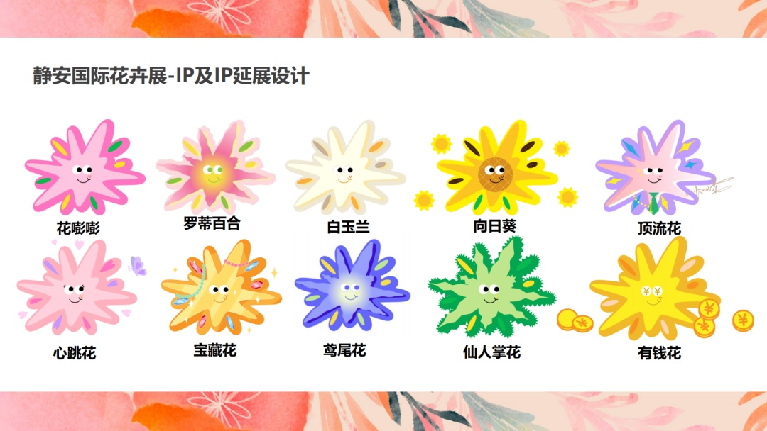首届静安国际花卉展IP形象由一个主IP“花嘭嘭”结合九个延伸IP组成。创意类:花嘭嘭、心跳花、顶流花、宝藏花、有钱花;花卉类:罗蒂百合、白玉兰、向日葵、鸢尾花、仙人掌花。