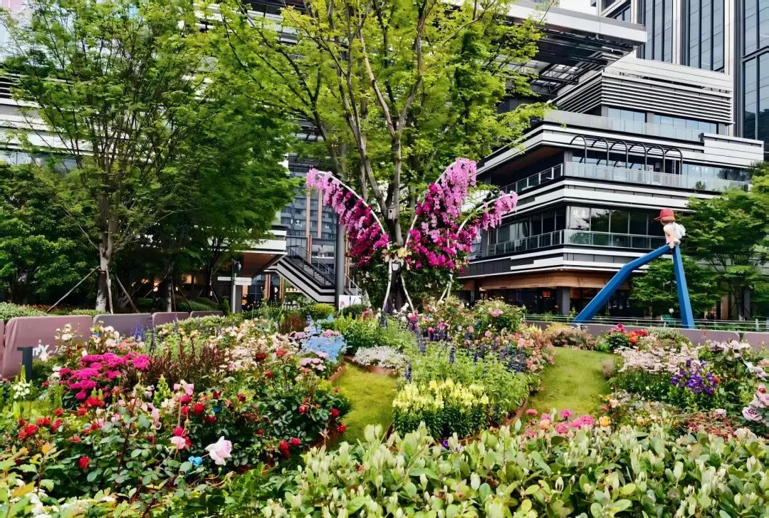 巨型粉红卡通瓶子造型搭配巨型花卉装置,挺立在一片色彩鲜艳、高低错落的花境中,将童趣与自然美学融合,成为春日打卡的视觉焦点,是城市自然艺术的温柔表达。