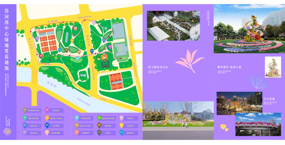 A2(流光绣羽)—A1(纵马踏花向自由)—B3(空中花廊)—B4(繁花里·空中石库门)—A5(花漾萌宠乐园)—B5(岩间绮梦)—C2(慎余里静安好市)—A6(窗阳台绿化展示园)—B6(稚年花梦)—B7(梦幻花谷)—B8(花开蝶满枝)—B9(繁花静安·绽放万象)—A4(海韵花径·月季诗影)—B1(心相花艺)—A3(花·丘)B2(流动之境)—C1(天后宫园林文创市集)
