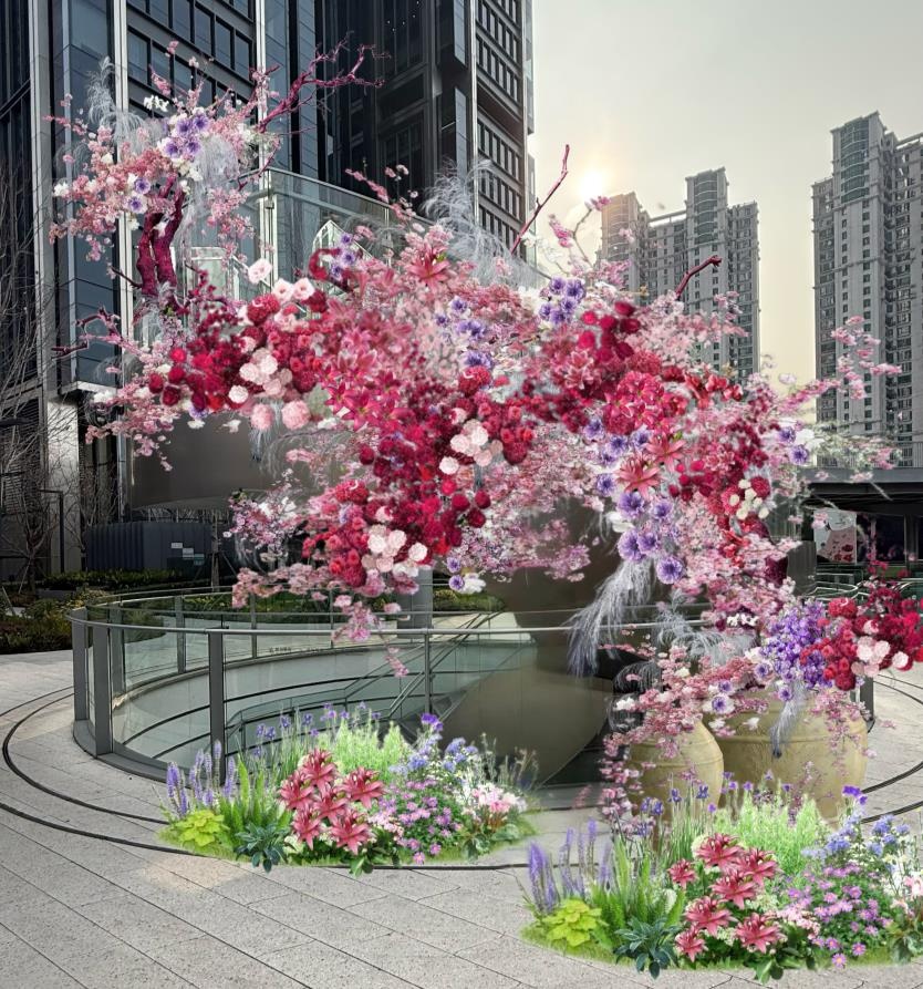 以“繁花似锦·绘筑芳华”为设计主题,打造兼具经典与摩登的都市花卉秘境,紧扣静安“经典、浪漫与摩登”的基因,萃取海派文化底蕴与当代时尚气质,整体采用勃艮第红、墨绿等高级色调,精选牡丹、奥斯汀玫瑰等花材,搭配银叶菊提升质感,将商业与自然、快节奏与慢生活完美衔接。