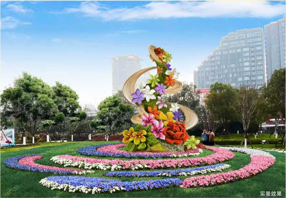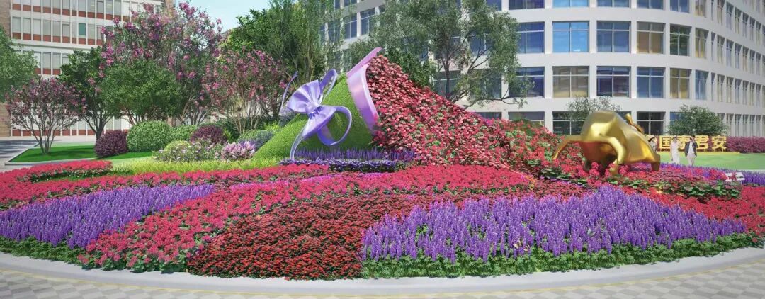 一组高低错落的花簇,九组花束与花球如微缩的山丘起伏绵延,与相邻的花束绿雕遥相对望。元宝形态的花境温柔围合,将“汇聚成景、生息相映”的意象层层晕染,为“繁花静安”增添灵动韵律,也让街角邂逅有了最温暖的注脚。