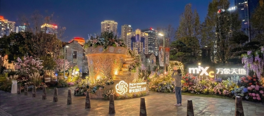 一座盛放的花束,粉紫云霭倾泻成柔美弧线萦绕金牛,从雕塑延伸至地面,绘就“繁花似锦,落地生花”的大地艺术画卷,为“繁花静安”注入烂漫生机,让街角邂逅更添梦幻。