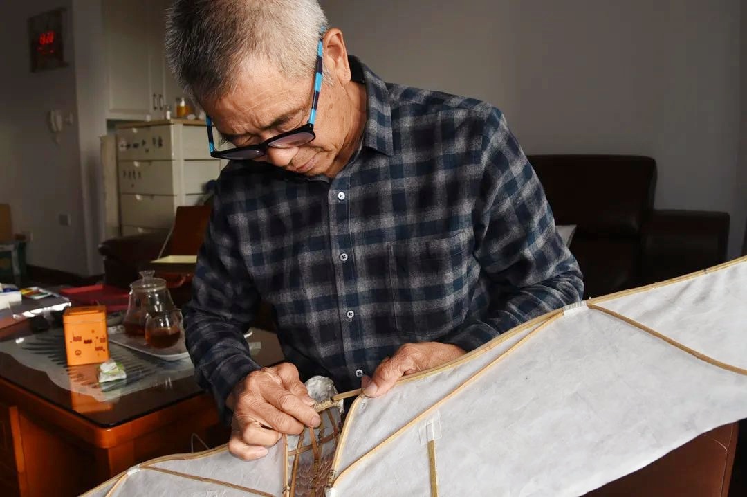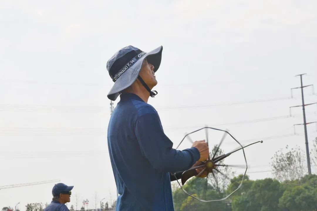 倪建明今年67岁,是嘉定秋博风筝队的领军人物。他曾多次带领队伍参加长三角各大风筝比赛。倪建明与“盘鹰”结缘已有近20年,“最初与好友在城隍庙偶然看到有人在售‘鹰’型风筝,买回来放飞时发现只能往单方向转圈,感觉不过瘾,于是就有了自己改良制作的想法。”