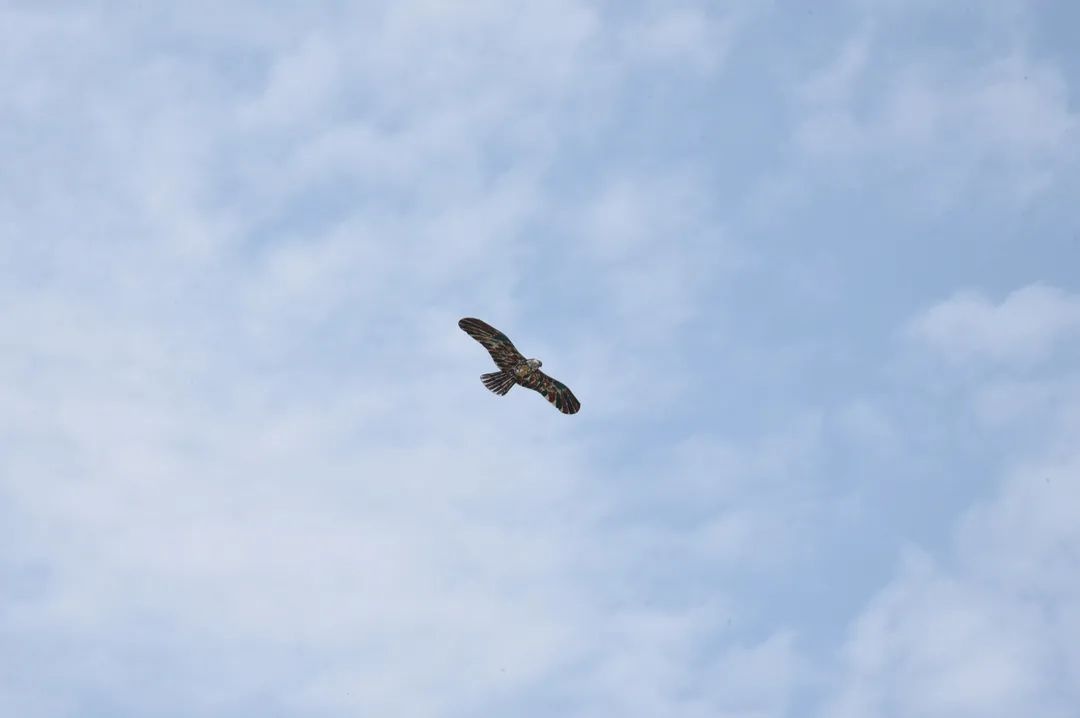 左手转动线轮、轻拉细线,右手把风筝放上天空,一瞬间,风筝扶摇直上,随后左右盘旋、上下翻滚……盘鹰风筝在资深爱好者唐岱元的放飞下好似拥有了灵魂,如同一只正在翱翔的雄鹰。