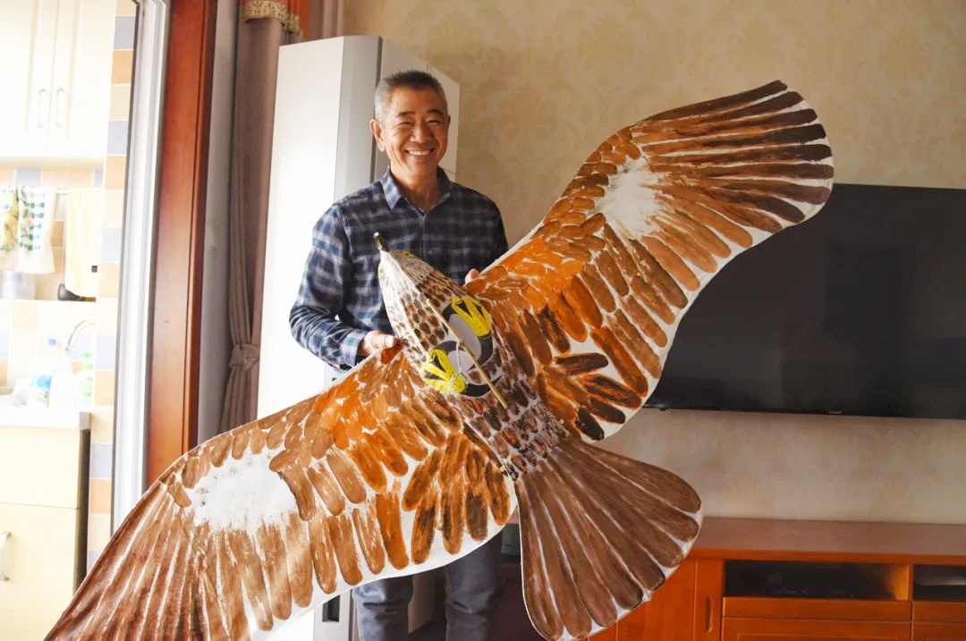 盘鹰风筝是一种模拟真鹰在高空或低空自由盘旋的运动风筝。与传统风筝相比,盘鹰风筝对放飞者的手眼配合要求更高,需要掌握熟练的操控手法。“不仅左右手要完美配合,还要调动全身的肌群。”唐岱元说,放飞“盘鹰”几分钟的运动量相当于快走30分钟。