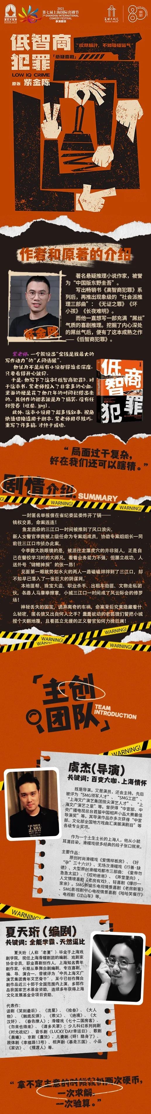 关于将这部小说改编成舞台剧的契机,导演虞杰表示,他是紫金陈的书迷,看过几乎所有他的书,但故事大多都比较严肃。直到《低智商犯罪》的问世,让他这个“喜剧人”看到了希望。