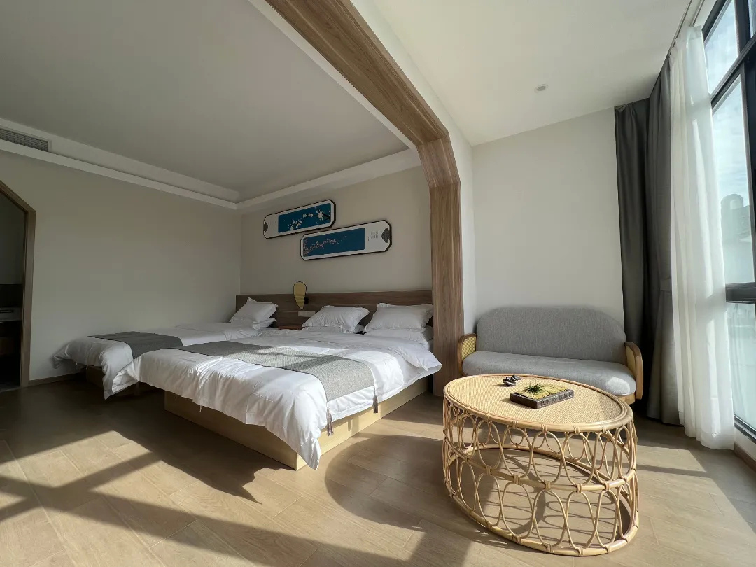 塘舍·桃以中式风格为主,桃花元素为点缀,武陵、玄都、红雨、阳春,以桃花别称命名的四间雅房,双人房、家庭房、大床房,适应不同的房客需求。