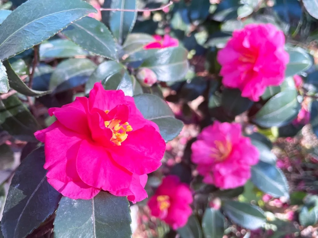 茶梅,顾名思义,属山茶科的一种,性喜阴湿,因其花型兼具茶花和梅花的特点,故称茶梅。茶梅花量多,体态玲珑,叶形雅致,花色艳丽,虽然花朵不如山茶般大而张扬,却有着小家碧玉般的秀美。茶梅凋谢时,花瓣会一片一片飘落,往往花色未褪,花瓣落在土壤上铺成小小的花毯。