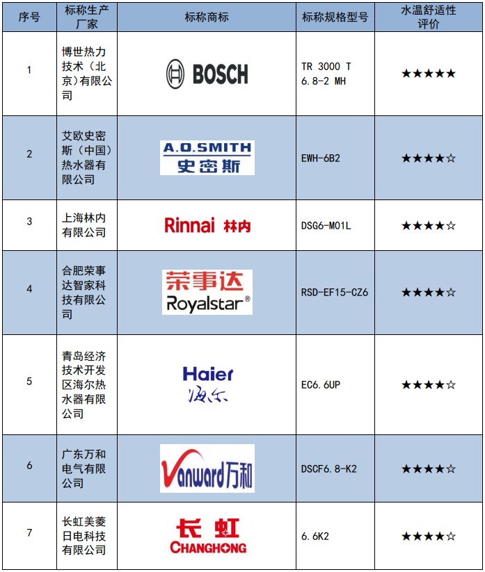 比较试验样品涉及美的、史密斯、Hai⁃er、BOSCH、林内、苏泊尔、TCL等品牌,产品容量在6升至7升之间,价格从249元至786.6元不等,委托上海市质量监督检验技术研究院对样品的水量充裕性、水温舒适性和节能性进行了测试。