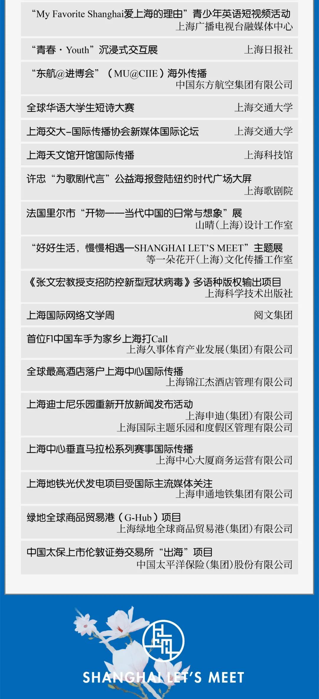 作为上海市国际传播领域最高奖项,本届“银鸽奖”聚焦中华文化国际表达、推广推介双创演绎、全球叙事能力建设和扩大国际“朋友圈”四大方向,从视频、声音、出版、设计、图片、国际新闻作品、活动/案例七大类别,甄选具有国际影响力、凸显上海城市精神和品格的示范引领性项目。