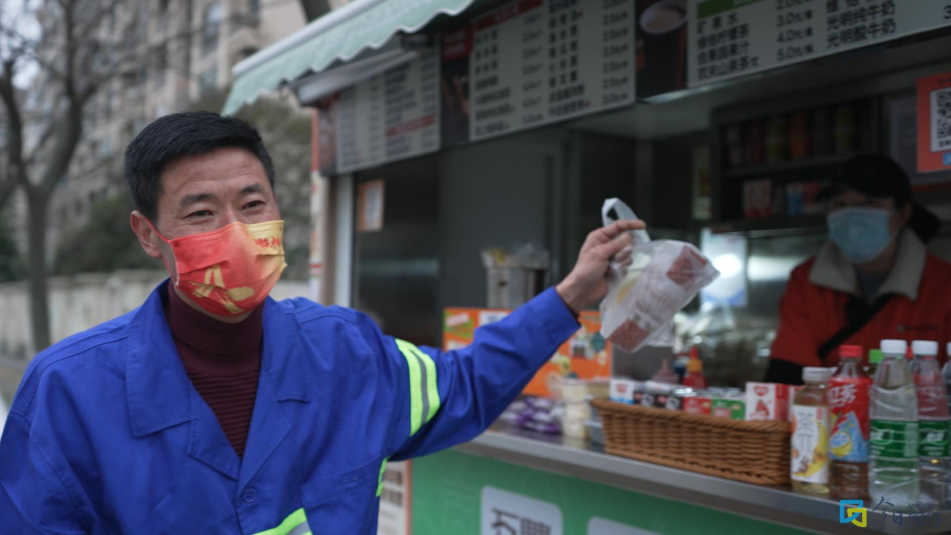 徐金红说她和一位环卫大叔特别有默契,“每天早晨五六点,他开车路过时总会按一声喇叭,这声喇叭好像是我们之间的暗号,听到了我就马上给他做早餐,每次都是饼和豆浆固定搭配。我这边做好了,他收好垃圾回来正好取走。”说话间,大叔准时回转到了早餐点,取走时向徐金红扬了扬早餐袋,表示感谢。