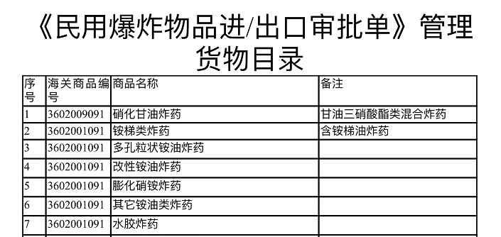 纳入民用爆炸物品品名表管理的民用爆炸物品包括工业炸药、工业雷管、工业索类火工品、其他民用爆炸物品、原材料等类别。《民用爆炸物品进/出口审批单》管理具体目录货物目录由《海关总署 工业和信息化部公告2018年第151号》(关于实施《民用爆炸物品进口审批单》《民用爆炸物品出口审批单》联网核查的公告)确定,可扫描下方二维码查询: