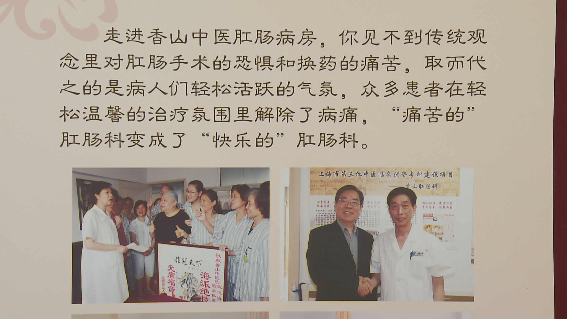 沈德海和团队用多年的努力将传统认知里头气氛紧张、充满痛苦的肛肠科发展成了香山医院的特色专科——快乐肛肠科,病人们在轻松愉快的氛围中,就能告别困扰多年甚至几十年的苦恼,这让许多患者非常的感恩。病房的走廊里挂满了患者康复后送来的礼物,感谢信、锦旗、还有十字绣、书法字画等等,许多患者自发在小红书、抖音等app上医院做广告。而沈德海和他的团队们希望,能有更多的患者可以放下“成见”,轻松的告别疾病困扰,“重获新生”。