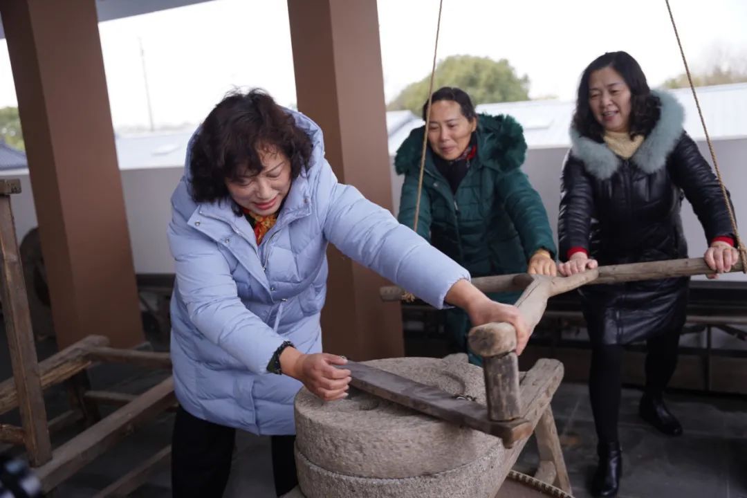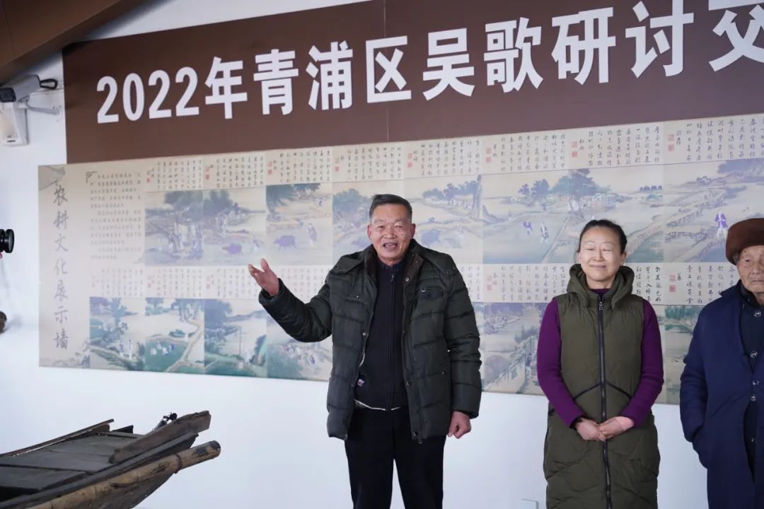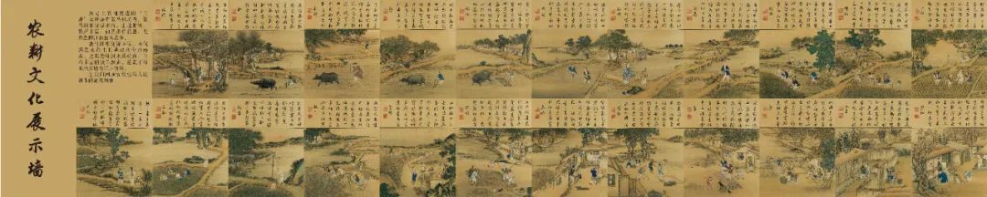 历史上名闻遐迩的“三泖”就坐落在张马村境内,张马村水资源丰富,土地肥沃,特产丰富,自然条件优越,是典型的江南鱼米之乡。传习所内的农耕文化展示墙,以图文模式生动形象地展示了古代张马人民依托泖河耕作的场景。这张长卷反映了古代农耕社会生活的方方面面,可以看到古时耕种的全过程:浸种、耕、耙耨、耖、碌碡、布秧、初秧、淤荫、拨秧、插秧、一耘、二耘、三耘、灌溉、收刈、登场、持穗、舂碓、簸扬、砻、入仓、祭神……