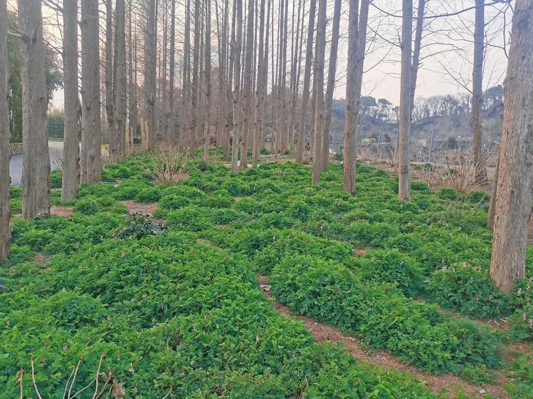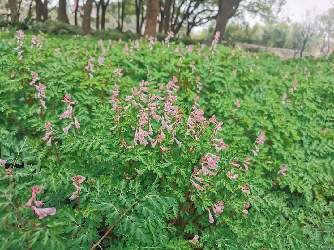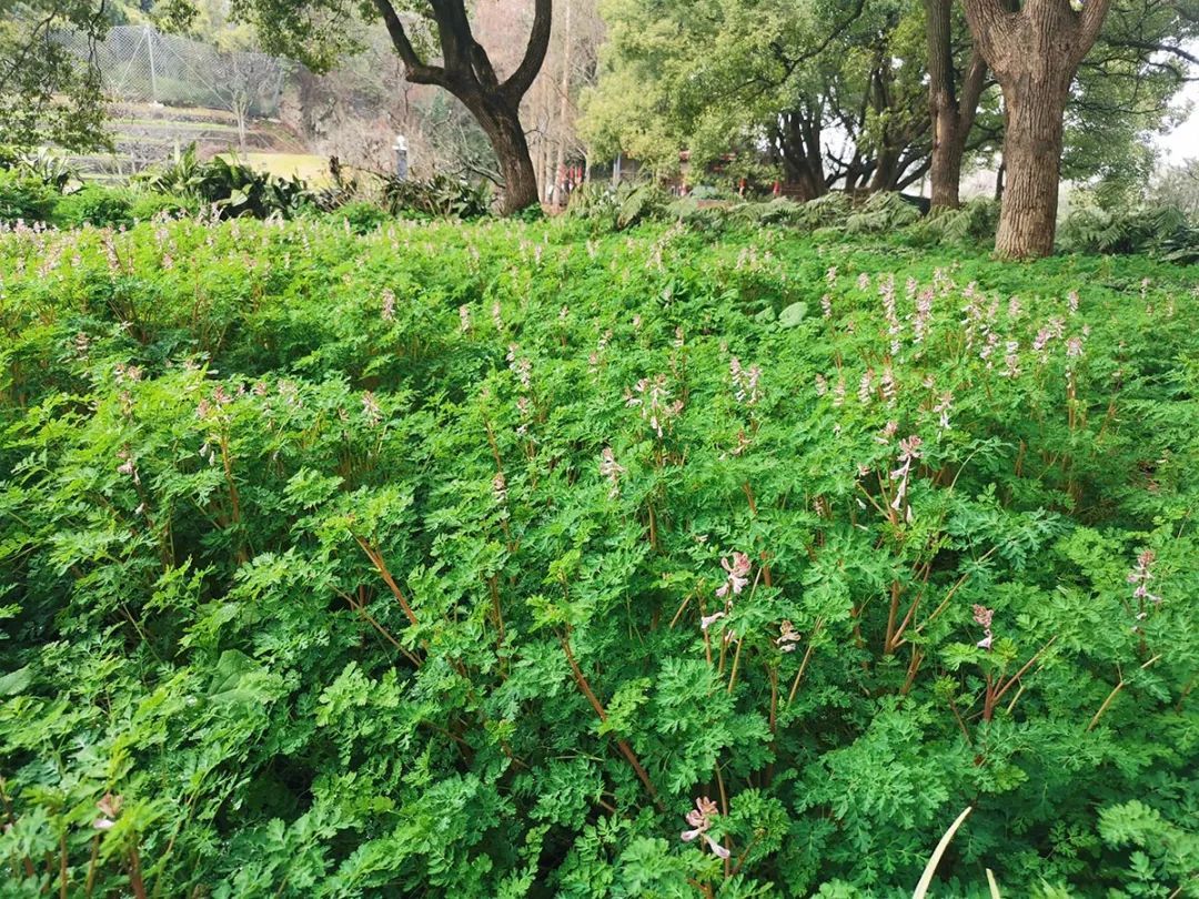在辰山植物园矿坑花园出口处、萧瑟的水杉林下和岩石园的香樟林下,已是一片绿意盎然,紫堇的粉色花苞纷纷窜出,少数按捺不住的鸟雀状花朵早已开放,远远望去像一串串跳动的音符。再过两周,这里将变身为一片粉色紫堇花的海洋。