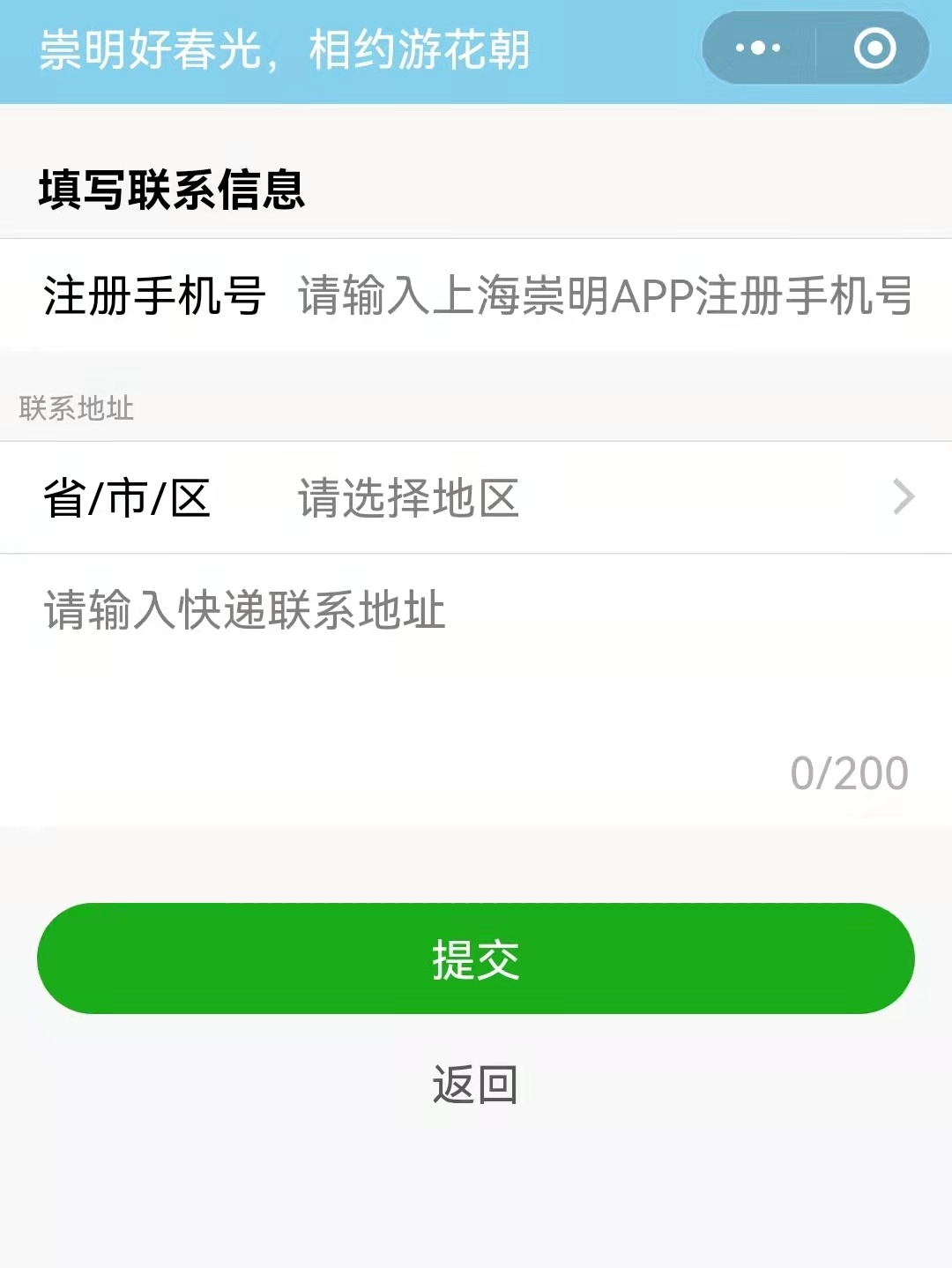 步骤一:点击开始浇水,填写“上海崇明”APP注册手机号及快递联系地址,活动仅限“上海崇明”APP注册用户参加,非注册用户参加兑换无效。