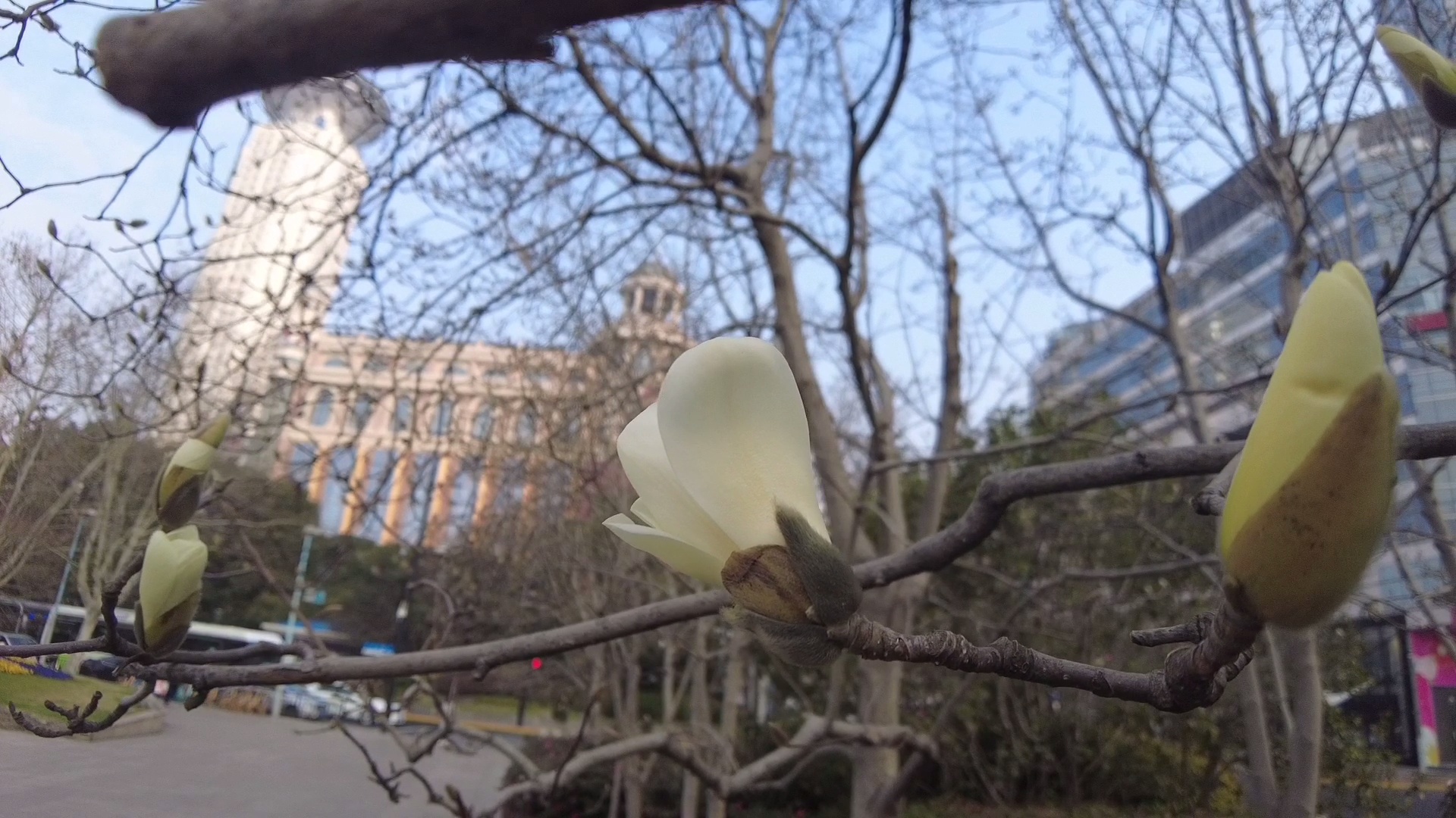 这位家住人民广场附近的75岁阿婆,特别关注这一片白玉兰的生长。她说,这一角有三四棵白玉兰,可能是阳光、水分或者品种等原因,总是会率先开花。刚开花的白玉兰花瓣上白中带着一点淡淡的黄,在蓝天、阳光下,格外婀娜多姿。
