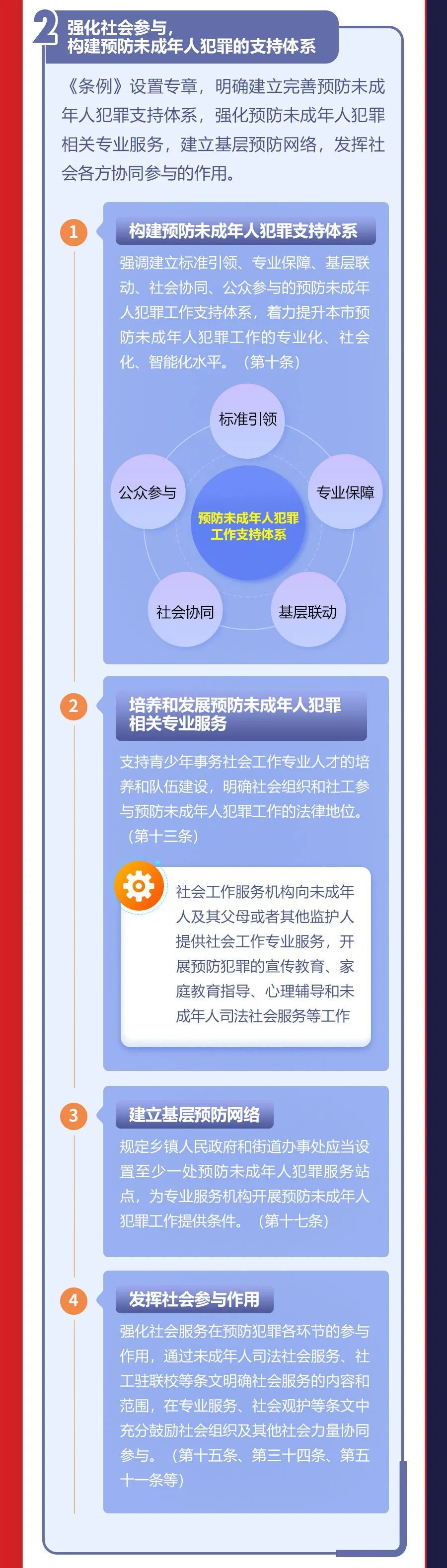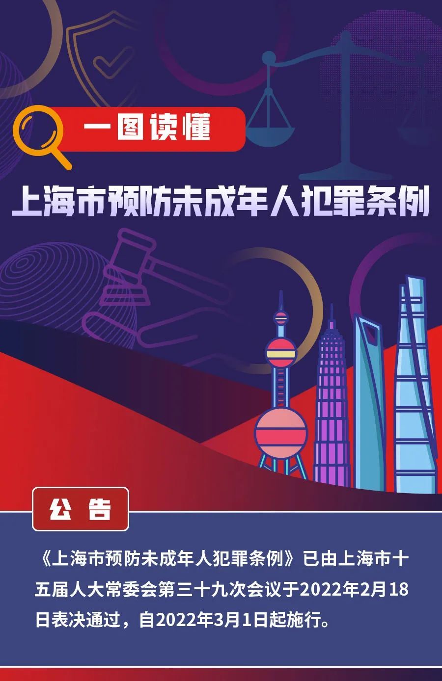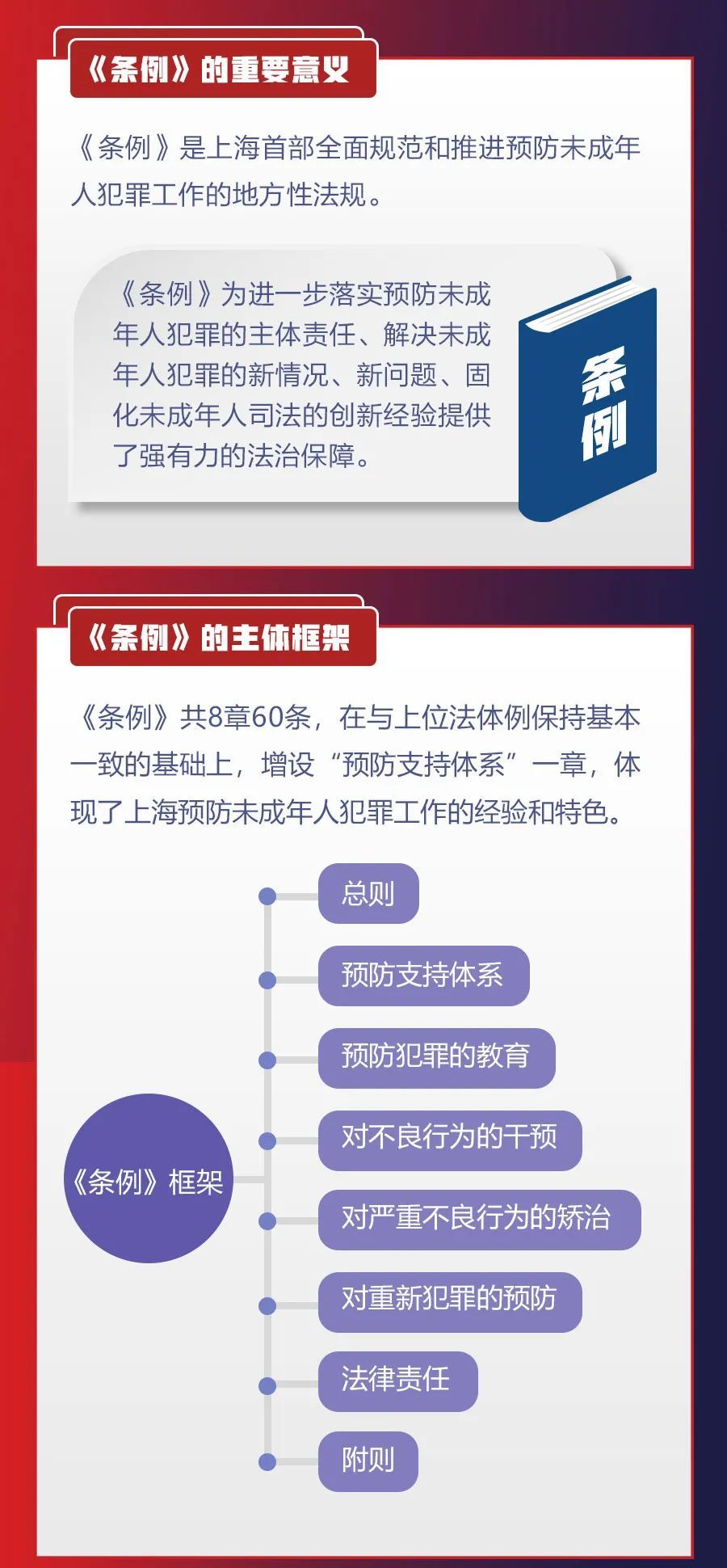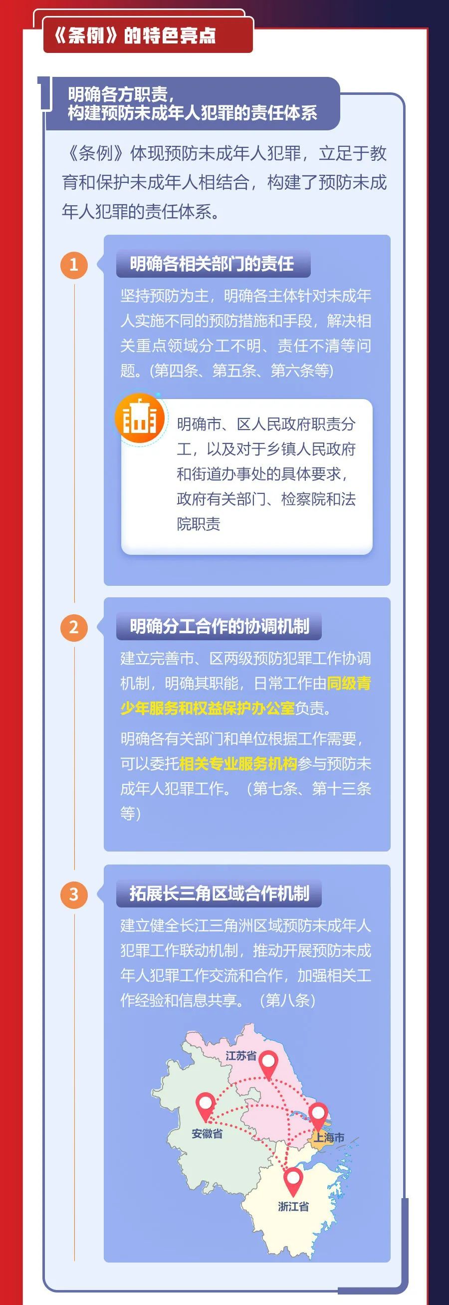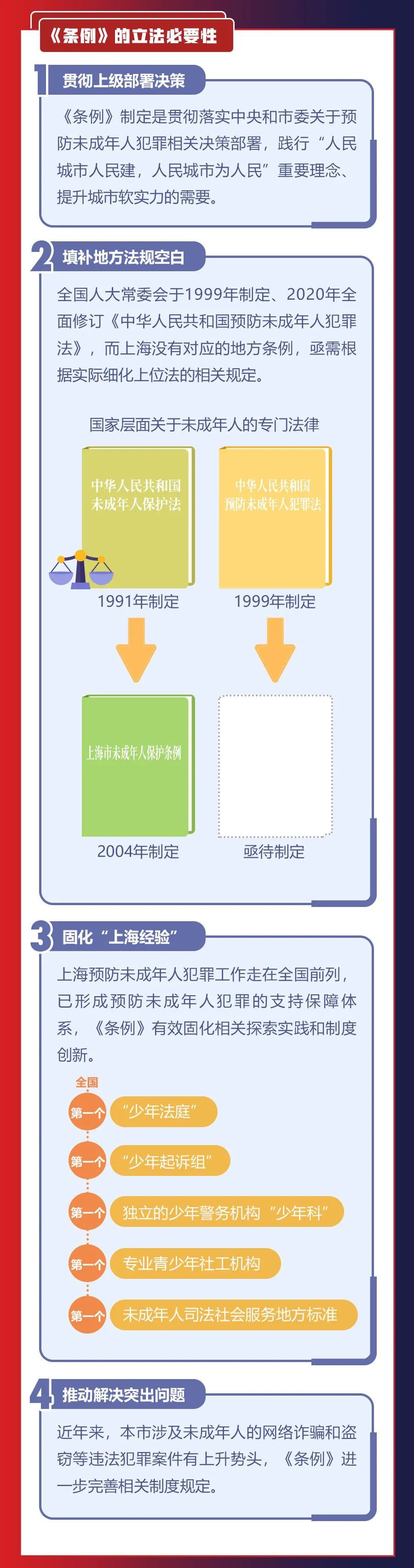 共青团上海市委员会、上海市青少年服务和权益保护办公室介绍,2月18日,《上海市预防未成年人犯罪条例》(以下简称《条例》)经市十五届人大常委会第三十九次会议表决通过,于今日施行。《条例》是上海首部全面规范和推进预防未成年人犯罪工作的地方性法规,设总则、预防支持体系、预防犯罪的教育、对不良行为的干预、对严重不良行为的矫治、对重新犯罪的预防、法律责任、附则等共8章60条。详见↓