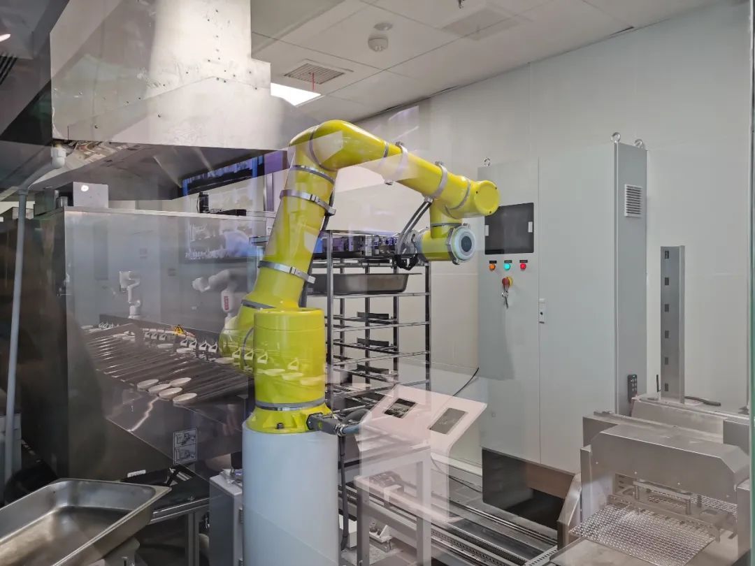 透过智慧烹饪区的玻璃窗,“机器大厨”——无人机械臂自动烹饪的过程一览无余。机械臂会将净菜放入对应的智能烹饪系统中,系统则自动根据当日菜单识别食材并进行煎烤蒸煮、收汁回温。