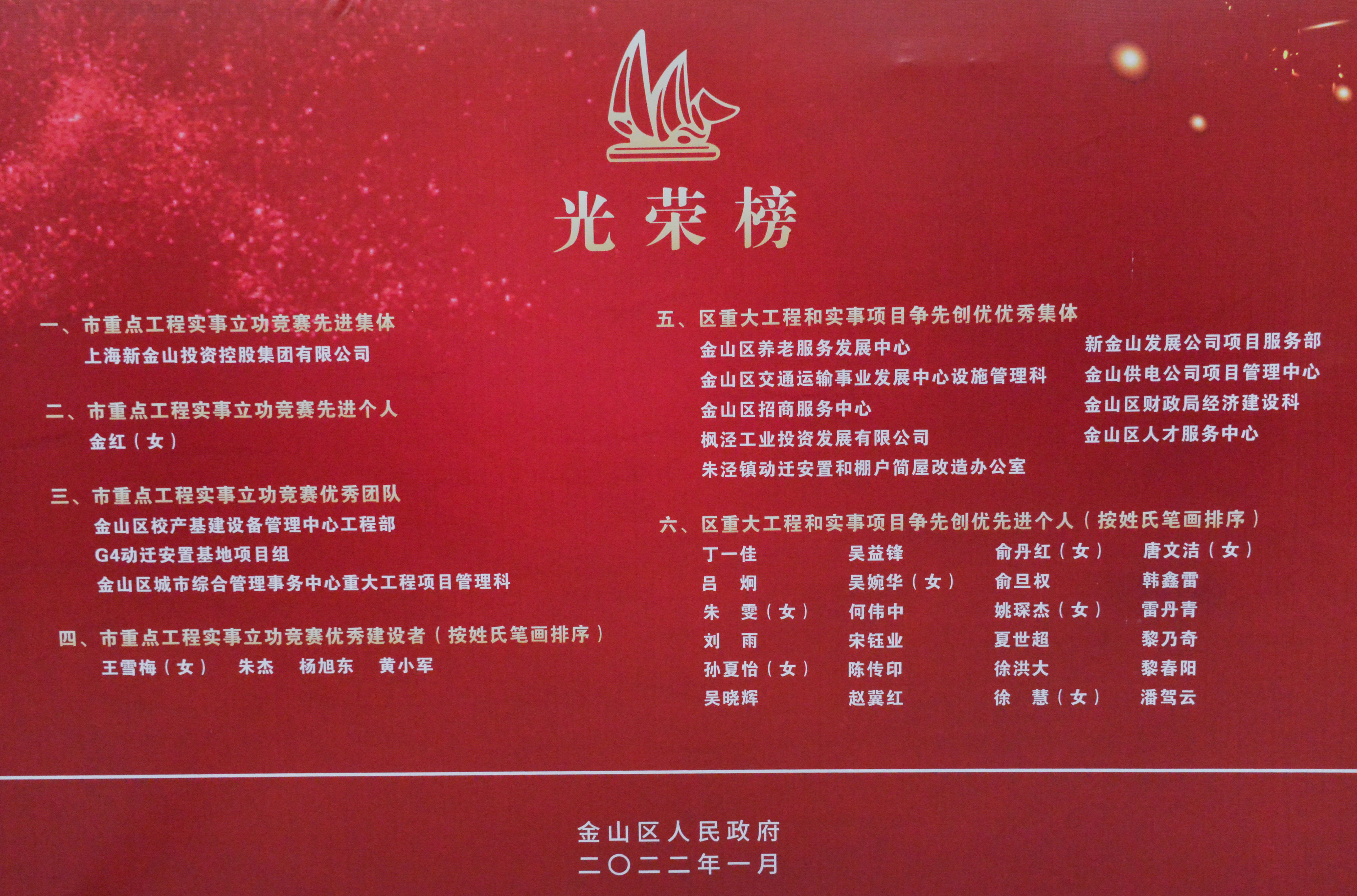 会上还总结了金山区重大工程和实事项目2021年建设工作,部署了2022年建设工作,对荣获2021年度重大工程和实事项目争先创优荣誉称号的9个优秀集体和24名先进个人进行表彰,并与部分重大工程实事项目责任单位进行签约。