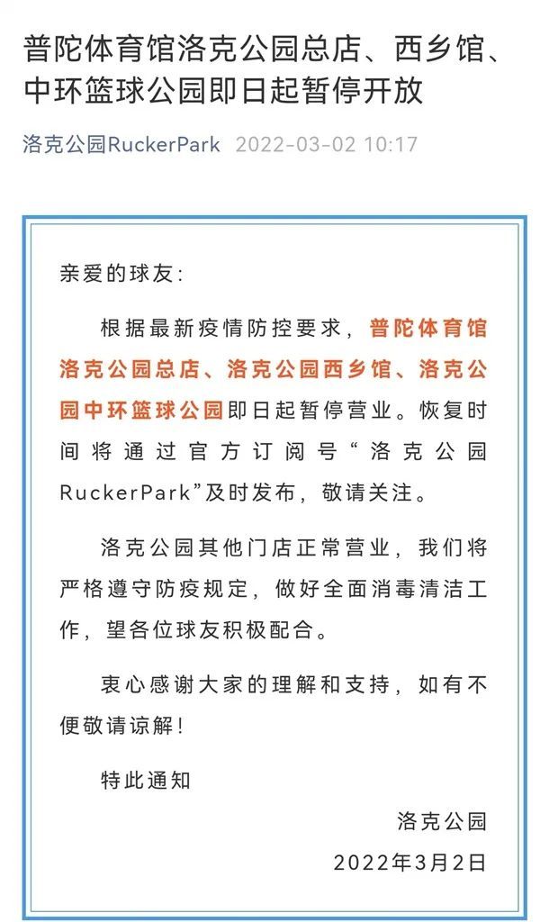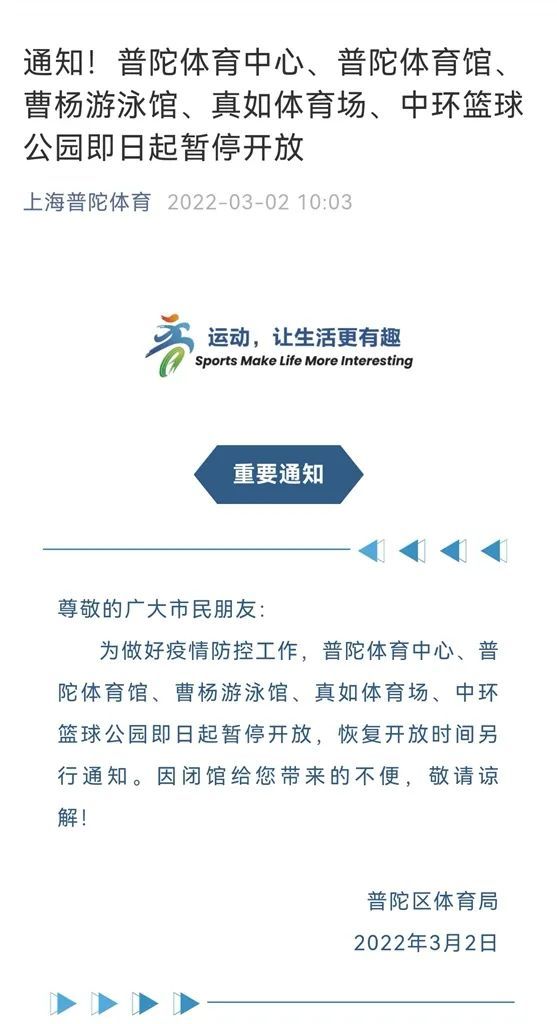 市体育局介绍,为做好疫情防控工作,普陀体育中心、普陀体育馆、曹杨游泳馆、真如体育场、中环篮球公园、普陀体育馆洛克公园总店、洛克公园西乡馆、洛克公园中环篮球公园即日起暂停开放,恢复开放时间另行通知。详见↓