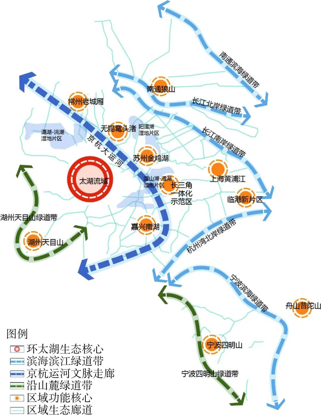 基于多维度的空间要素,区域绿道的空间结构也应当是复合多元的。首先,围绕太湖生态核心形成区域绿道环线,并依托长江、东海,形成五条滨海滨江绿道带。其次,沿京杭大运河文脉走廊形成运河绿道,沿龙池山天目山、四明山等山麓形成山体景观绿道。再次,通过若干条绿道连通区域重要功能和生态核心,包括长三角一体化示范区、上海黄浦江、临港新片区、苏州金鸡湖、无锡鼋头渚、常州老城厢、嘉兴南湖、湖州天目山、南通狼山、海门滨江、龙游湖景区、宁波四明山、宁波普陀山等重要生态功能区,以及吴淞江、黄浦江、太浦河、望虞河、西苕溪、余姚江、甬江、奉化江等骨干河湖和清水绿廊。在此基础上,依托上海大都市圈生态廊道,结合区域核心资源,在区域绿道空间结构的基础上,形成覆盖全域的6000千米左右区域绿道网络。