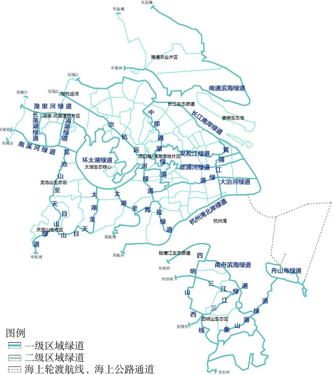 在连通区域重要战略资源方面,为更好地服务于长三角一体化示范区、临港新片区等重大战略区域,并进一步加强各城市核心功能区的联动效应,区域绿道应贯通各类区域重要战略资源、核心功能节点,增强其对周边地区的辐射效应,并以绿道贯通为抓手实现生态优先、绿色互联。