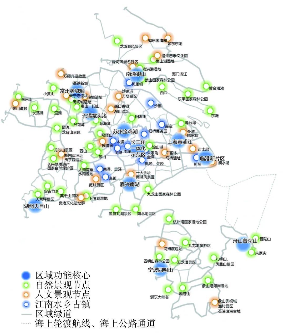 在连通核心景观节点方面,以丰富的自然生态和历史人文资源为依托,契合区域城乡空间布局,有机串联城乡自然、人文景观,发挥长三角特有的水乡、湖荡、山峦自然与文化优势构建布局合理、设施完备、低碳节能、互联互通的区域绿道网络系统。一方面,凭借得天独厚的生态基底,绿道连通富有地域特色的自然景观资源,包含太湖、阳澄湖、天目山、九龙山、普陀山、九龙湖、东滩、龙游湖等;另一方面,根植于深厚的文化积淀,绿道将特色鲜明、类型丰富的文化和旅游资源进行串联,包含一大会址、淹城遗址、广富林遗址、沙家浜、菰城景区、象山石浦渔港等。通过对核心景观资源的互联互通,最大化发挥资源价值。