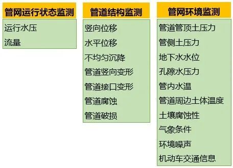 主要包括管网运行状态、管道结构和管网环境的监测参数。