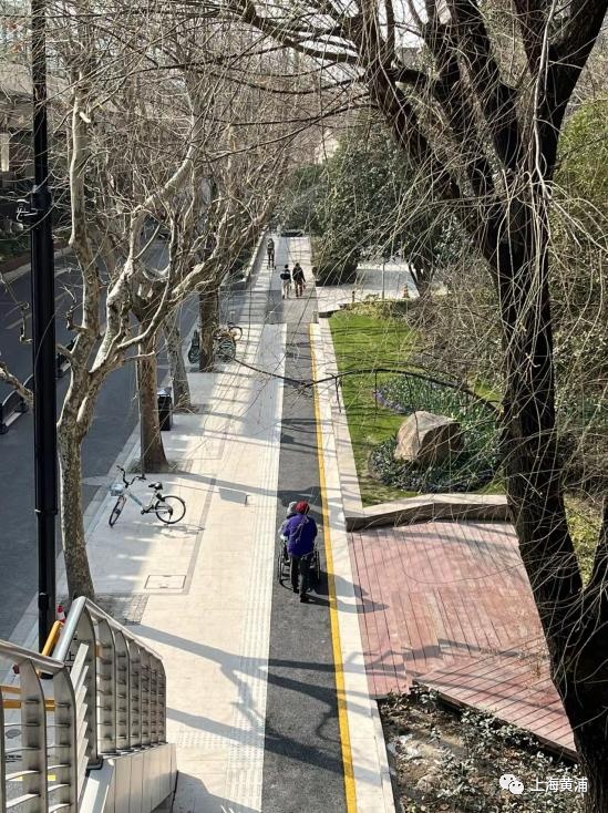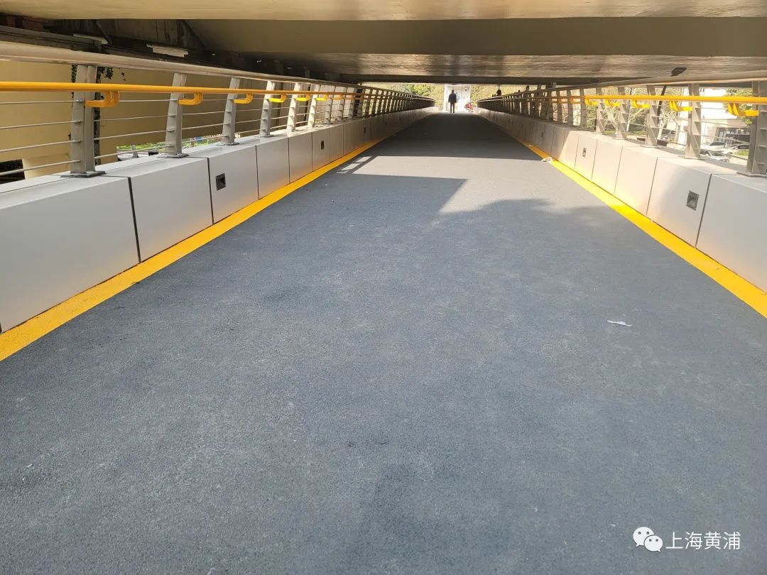 据悉,为了保障周边残疾人、老人等行动困难人群通行安全,区市政所在天桥相邻的医院、电梯出入口道路,采用稳定性、抗裂性更好的沥青材料,铺设友好步道,让行动困难人群出行便利,让轮椅车、婴儿车推行更顺畅。步道选用黄色作为边线,并绘制上了醒目的婴儿车和轮椅标识,构建出以人为本、舒适便捷的特色慢行区域,令人切实感受到了上海这座城市的包容、关怀和尊重。