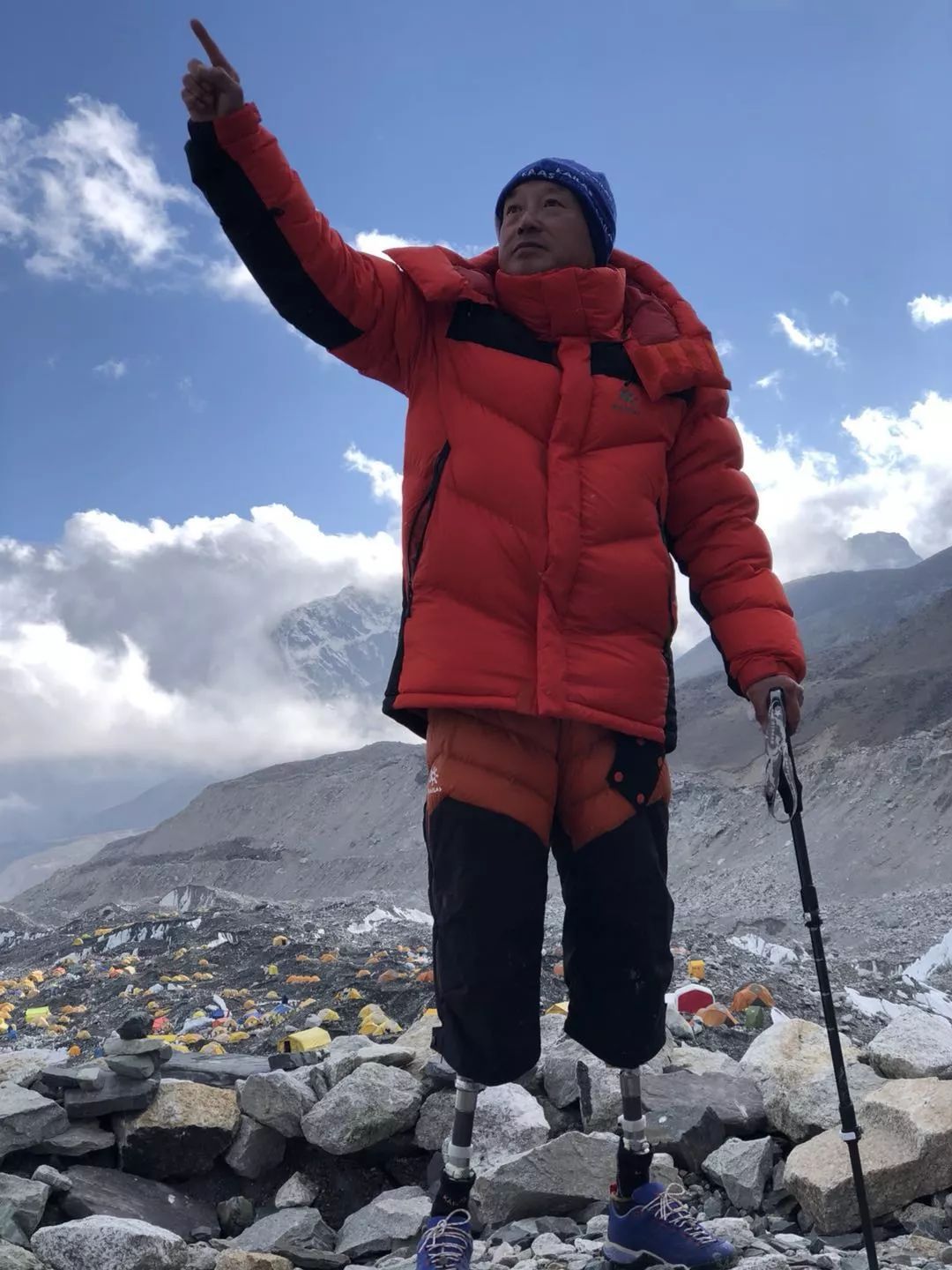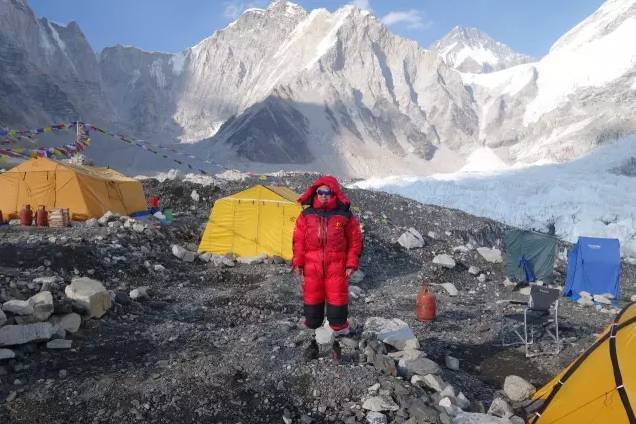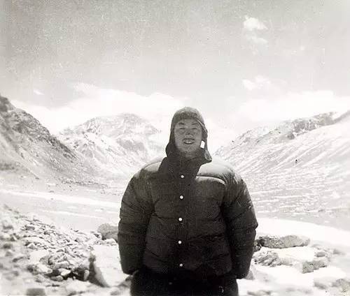 △1975年,夏伯渝穿着羽绒服在珠峰大本营