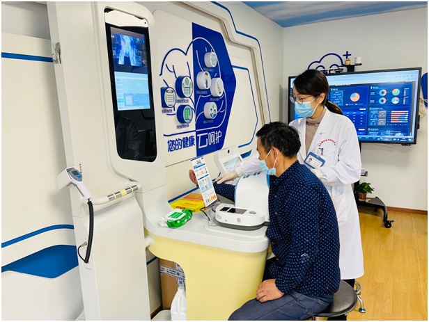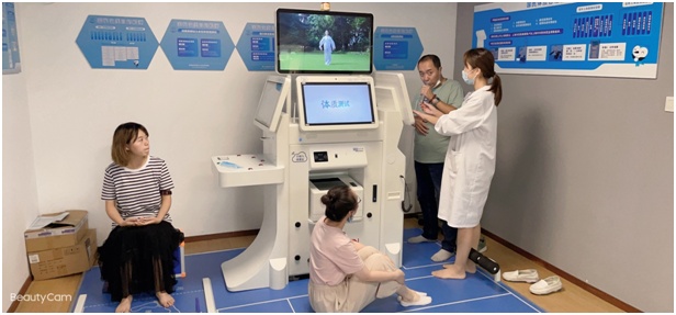 进入智慧健康驿站,站内有健康检测设备、体质测试设备、“健康云”机器等多种智能化设施设备,为居民提供实时、多样、智能化的健康服务。居民只用一张身份证或医保卡,就可以进行免费的身高、体重、脂肪、血压、体温、血氧、腰臀比、血糖、胆固醇、尿酸、心电图等多个体征指标的检查。同时还可以进行握力、肺活量、反应性等11项自助体质检测。由专业医护人员负责健康驿站的管理,引导居民使用和体验相关健康设备,并可线上查看体征数据、就医记录、用药清单、检查报告等有效信息。