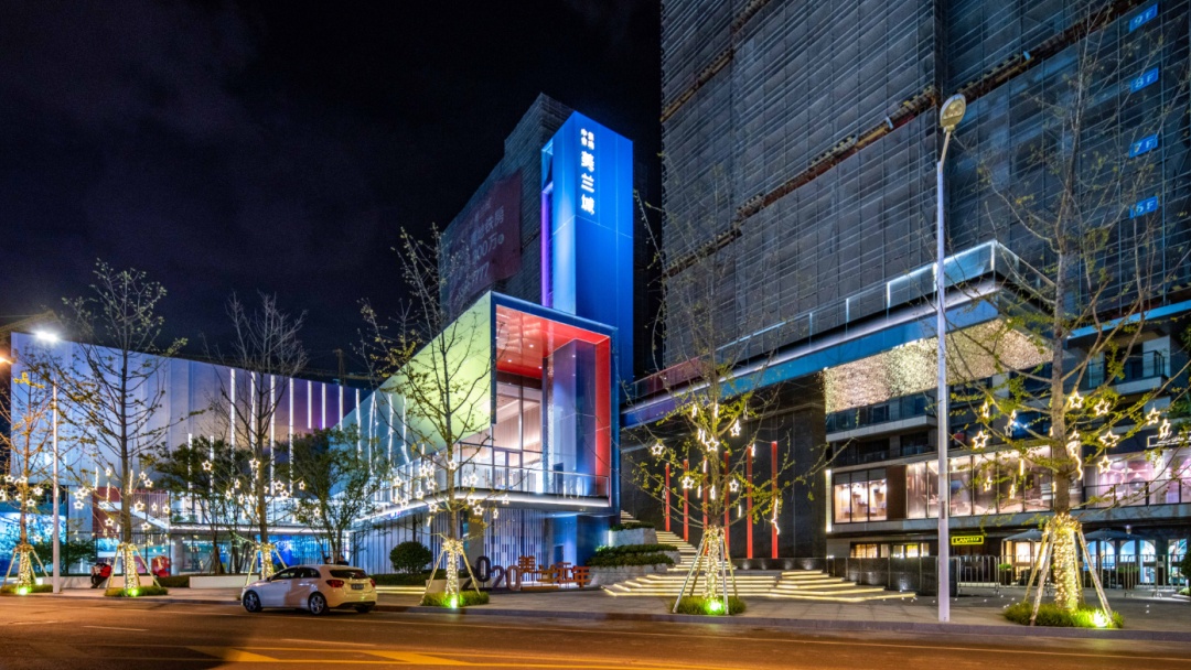 商街外立面采用简洁大气的现代风格,外墙采用玻璃单元及科技感铝板材质,以线性夜景灯光形式动感线条,让整个建筑群看起来更时尚。