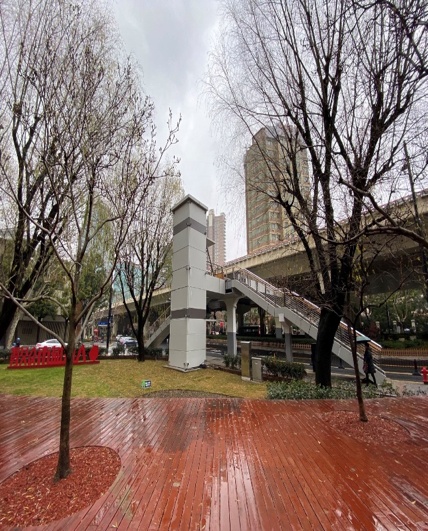 在外观设计、实际使用及维护管理等方面做了多方考虑,因地制宜的在既有天桥两侧加装垂直电梯,同时,将无障碍出行建设延伸至慢行区域,将全龄友好融入到周边步道中,为不同出行人群提供最大程度的便利。