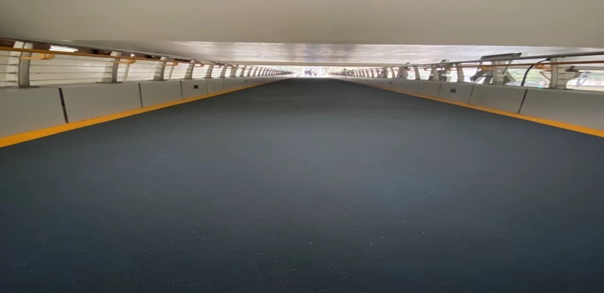 为了保障周边残疾人、老人和行动有困难的人们通行安全,还特别在与天桥相邻的医院、电梯出入口道路采用稳定性、抗裂性更好的沥青材料铺设友好步道,让轮椅车、婴儿车推行更平稳、顺畅。步道选用黄色做为边线,并绘制上了醒目的婴儿车和轮椅标识,构建出以人为本、彰显特色、又舒适便捷的特色慢行区域。