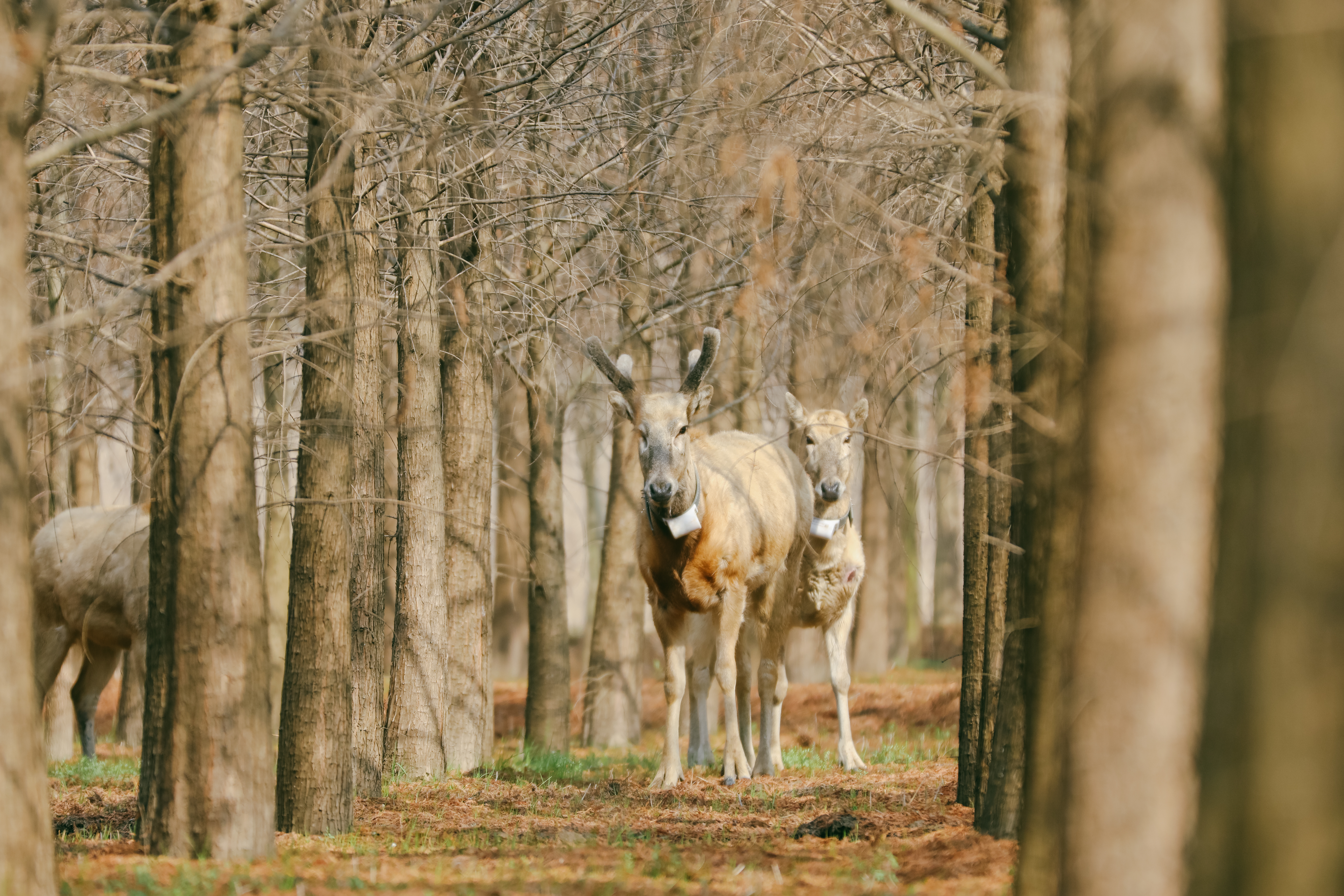 整个园区占地300多亩,被划分为麋鹿栖息区、麋田(轮牧)区、隔离区、水源涵养区和科普宣教区五个区域。在麋鹿栖息区,初来乍到的4头麋鹿似乎对林地还有些陌生,时不时东张西望,待确认安全后,便迈开步子,向林地深处走去,共同探索它们的新家。
