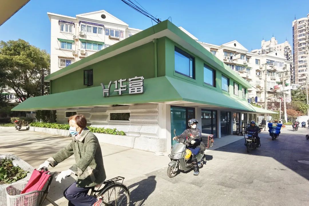 在上海徐汇区的漕河泾街道华富社区凯旋南路入口,两幢粉刷着明亮的“蒂芙尼蓝”颜色的双层尖顶建筑,在周边环境中显得格外醒目。这是2021年10月14日重阳节才启动揭幕的“华富邻里汇”。