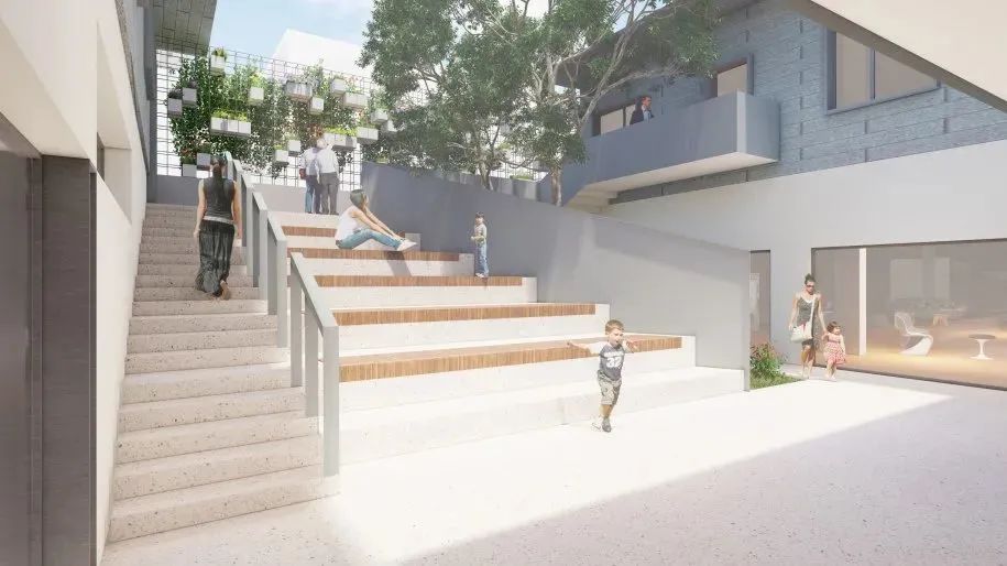 仓库沿高架一侧的围墙拆除,向街道开放,利用更为通透的玻璃界面在明确内部使用功能的同时提供亲切融洽的社区氛围。室内外过渡灰空间的连廊为居民提供驻留场所,高架下方通过绿化花台形成沿街庭院,使室内外空间联动呈现开放的姿态。