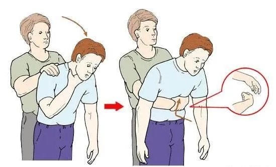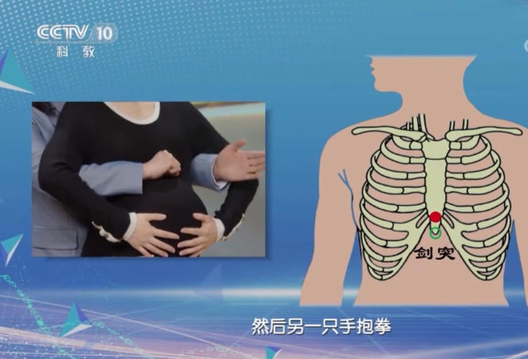 与一般的海姆立克急救法相同,施救者站在患者的身后,握拳放在胸骨下段,剑突的上方,而不是上腹部。另一只手抱拳,用向上、向内的力量按压胸骨下端。
