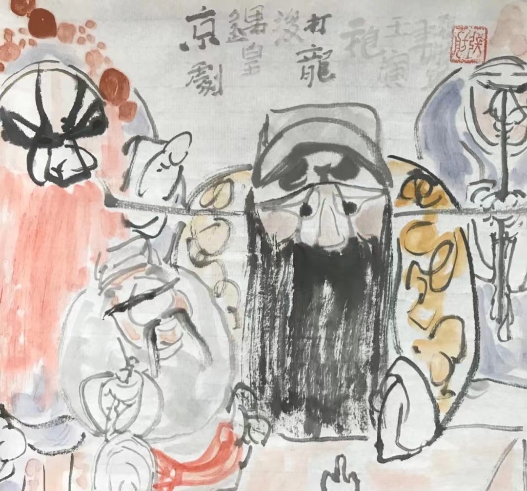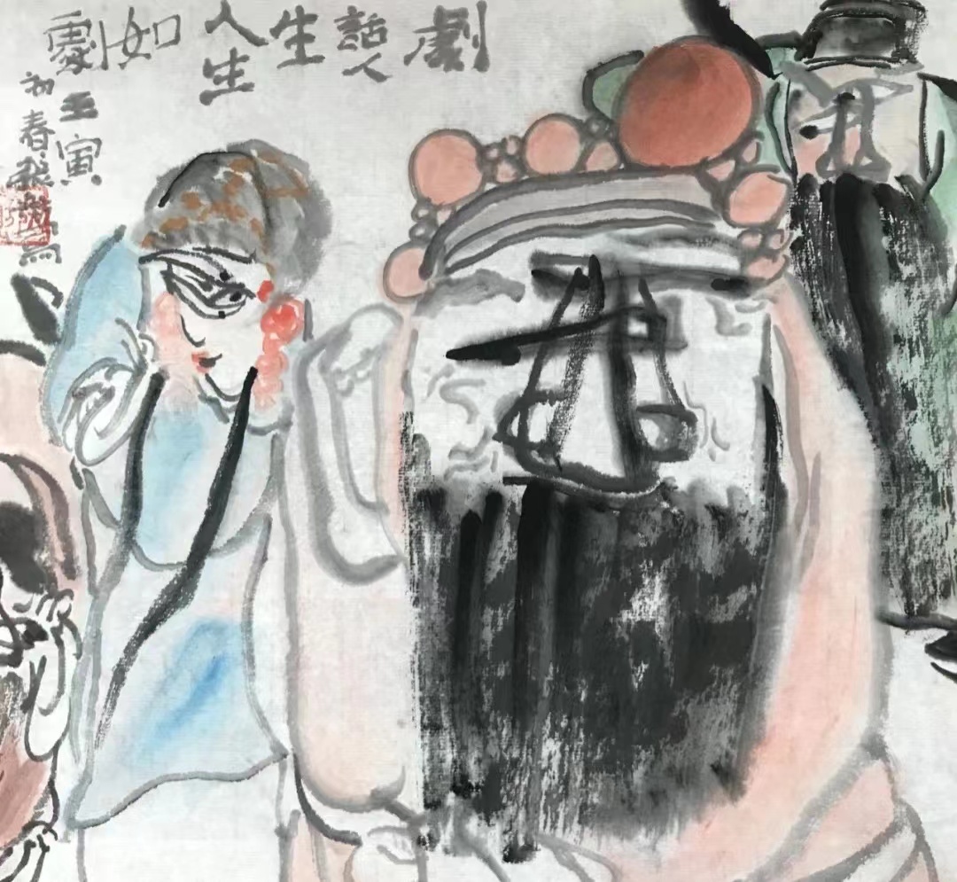 张舫的戏剧人物画就“法从关良”,以书入画,通过解构、抽象与重建,用充满爆发力的书法线条和变化丰富的墨色,凸显人物的个性和剧情的张力,形成独特的大写意画风。