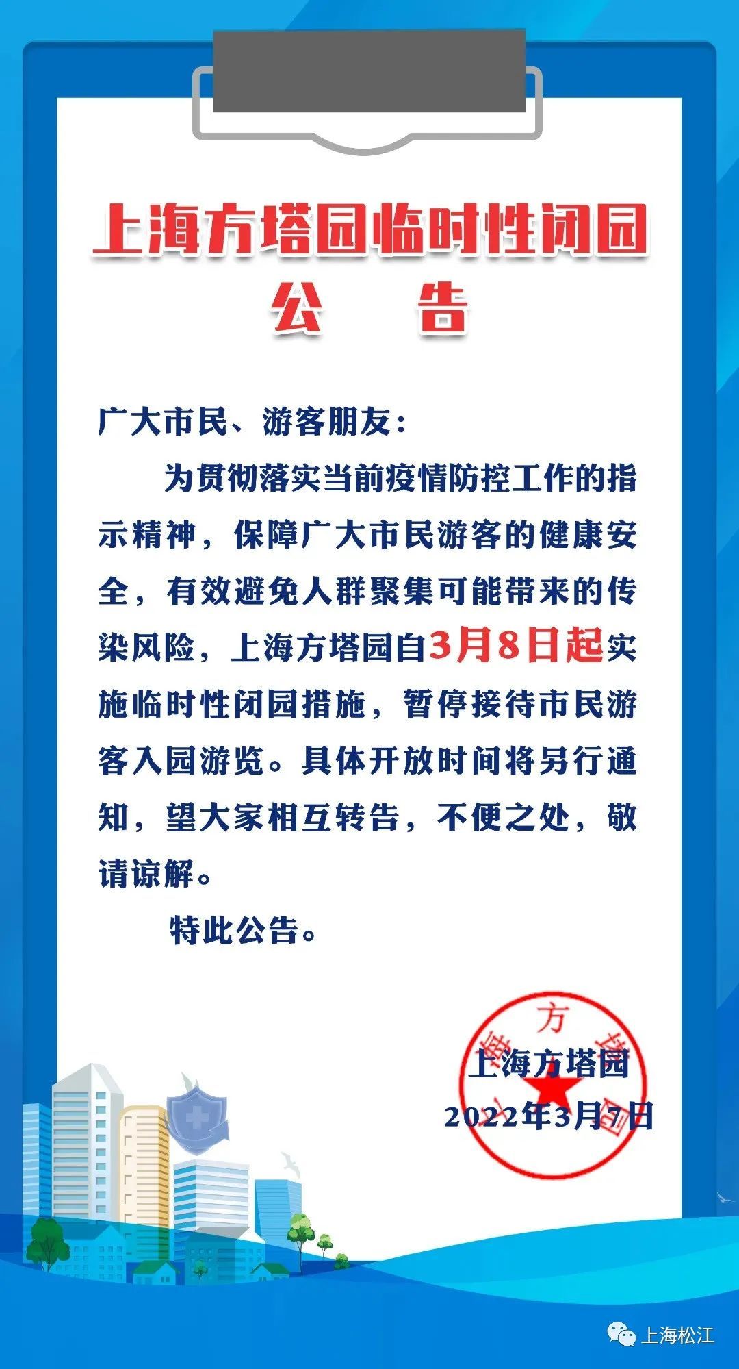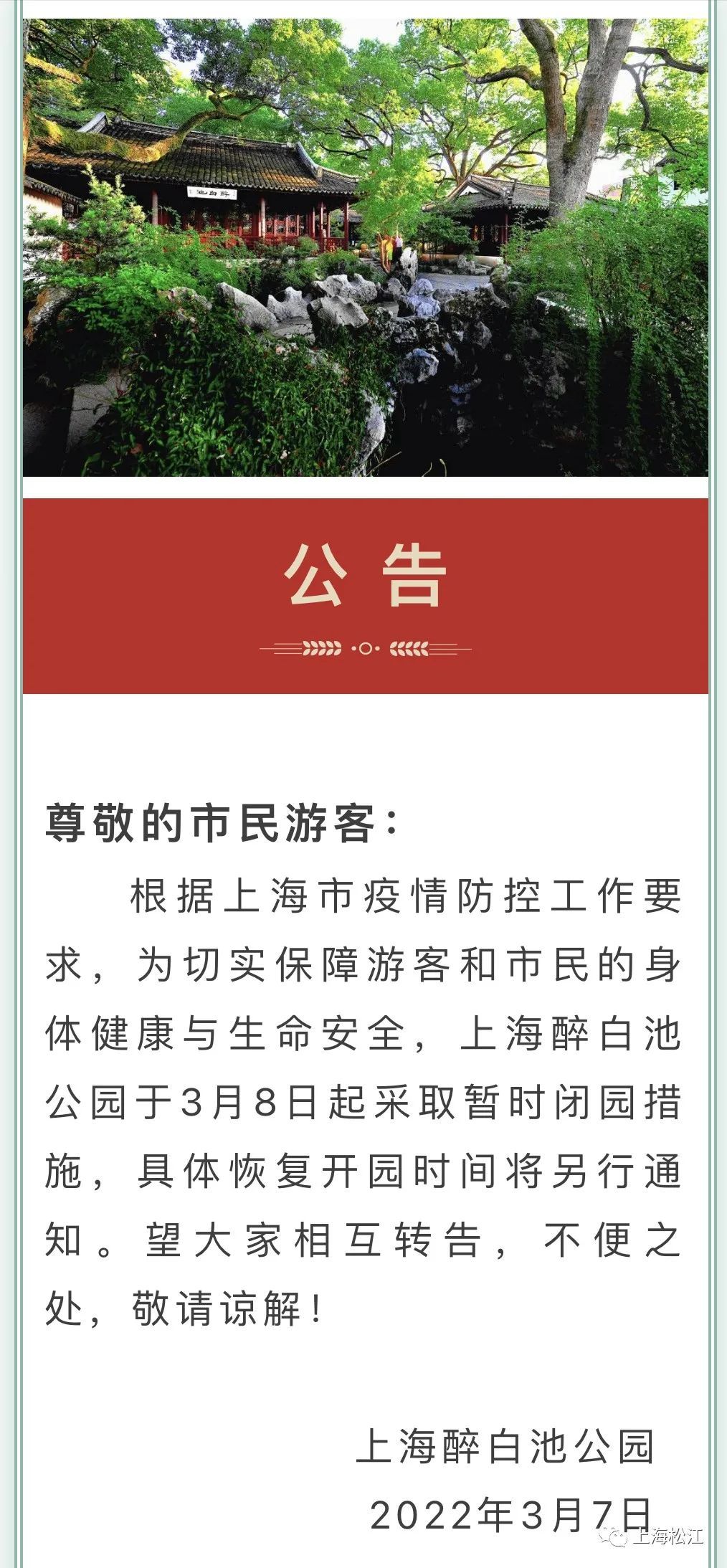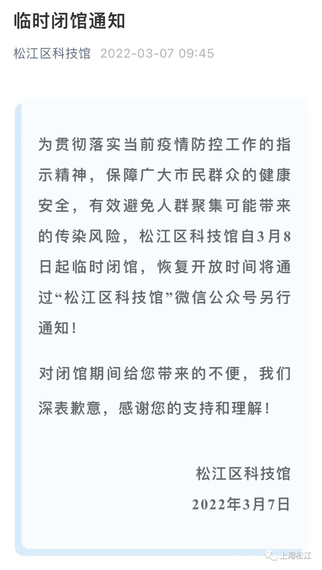 根据市疫情防控工作要求,明天(3月8日)起,松江部分景点、场馆临时闭园、闭馆,以降低人群聚集可能带来的传染风险。