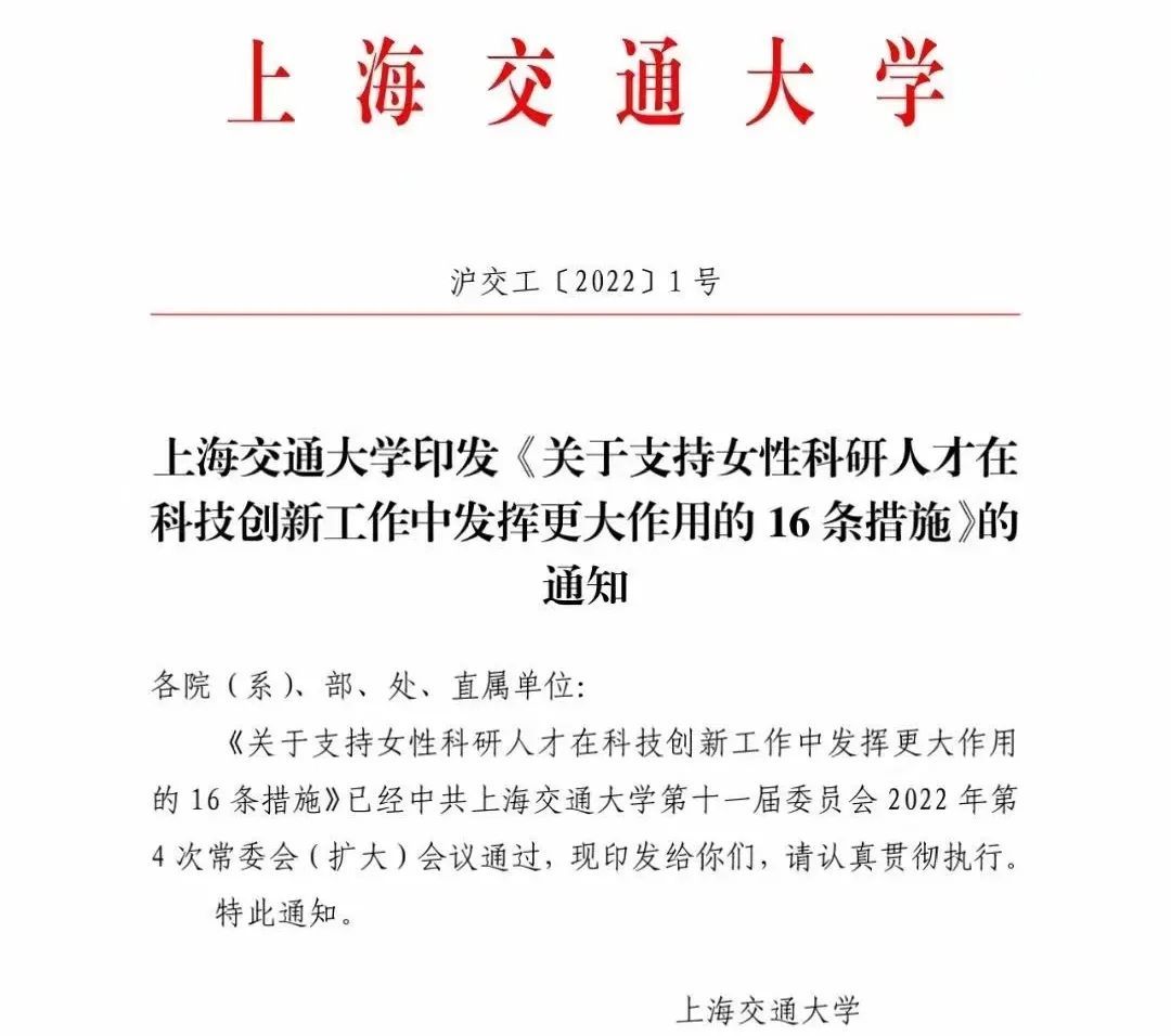 上海交通大学制定出台《关于支持女性科研人才在科技创新中发挥更大作用的16条措施》,为女性科研人才的研究工作与职业发展提供更多政策助力。