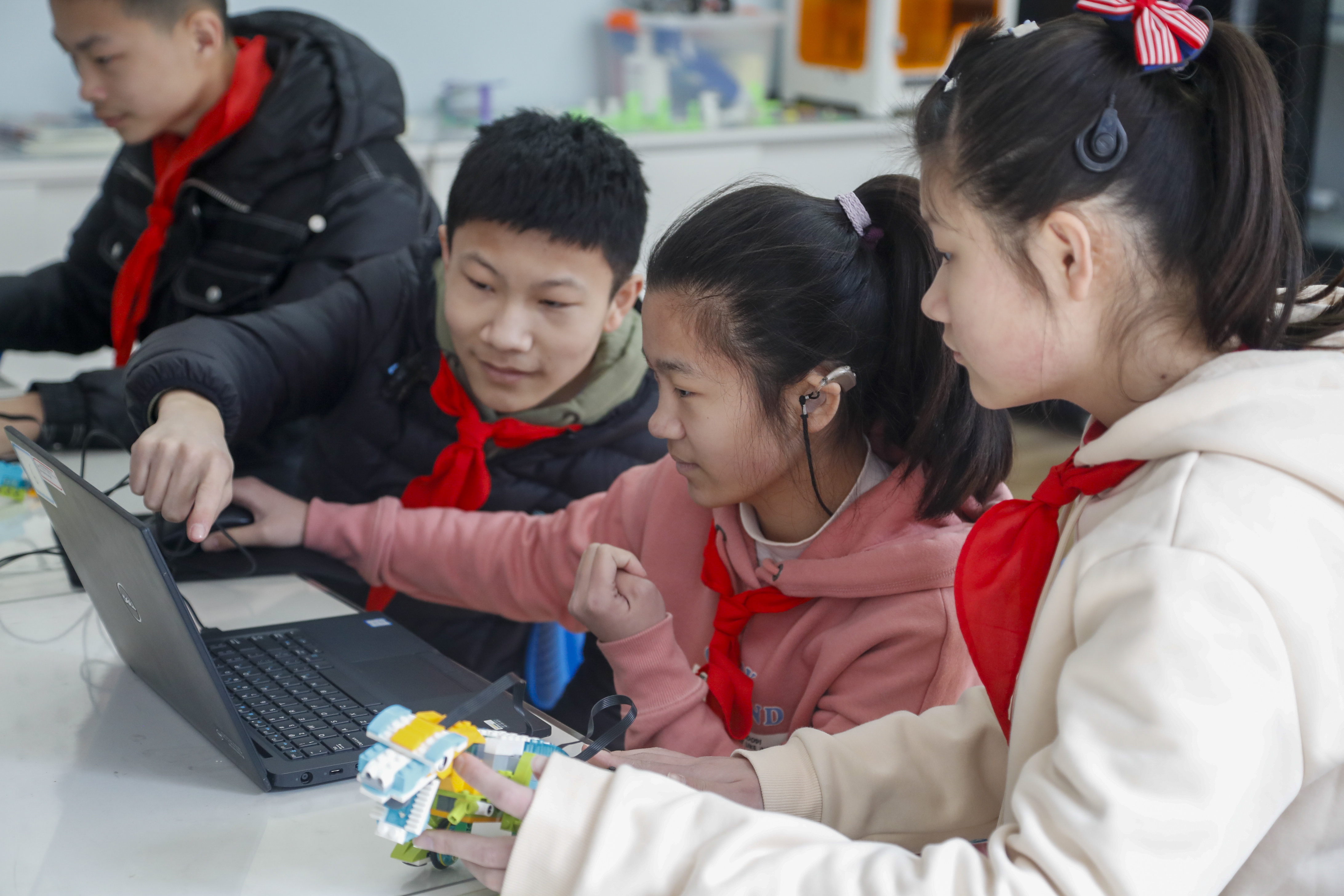 活动室里,8年级学生正在用电脑控制机器人前进、后退,活动老师告诉记者,这些模型都是学生们亲手搭起来的,看着机器人缓慢前行,孩子们的兴奋之情溢于言表。