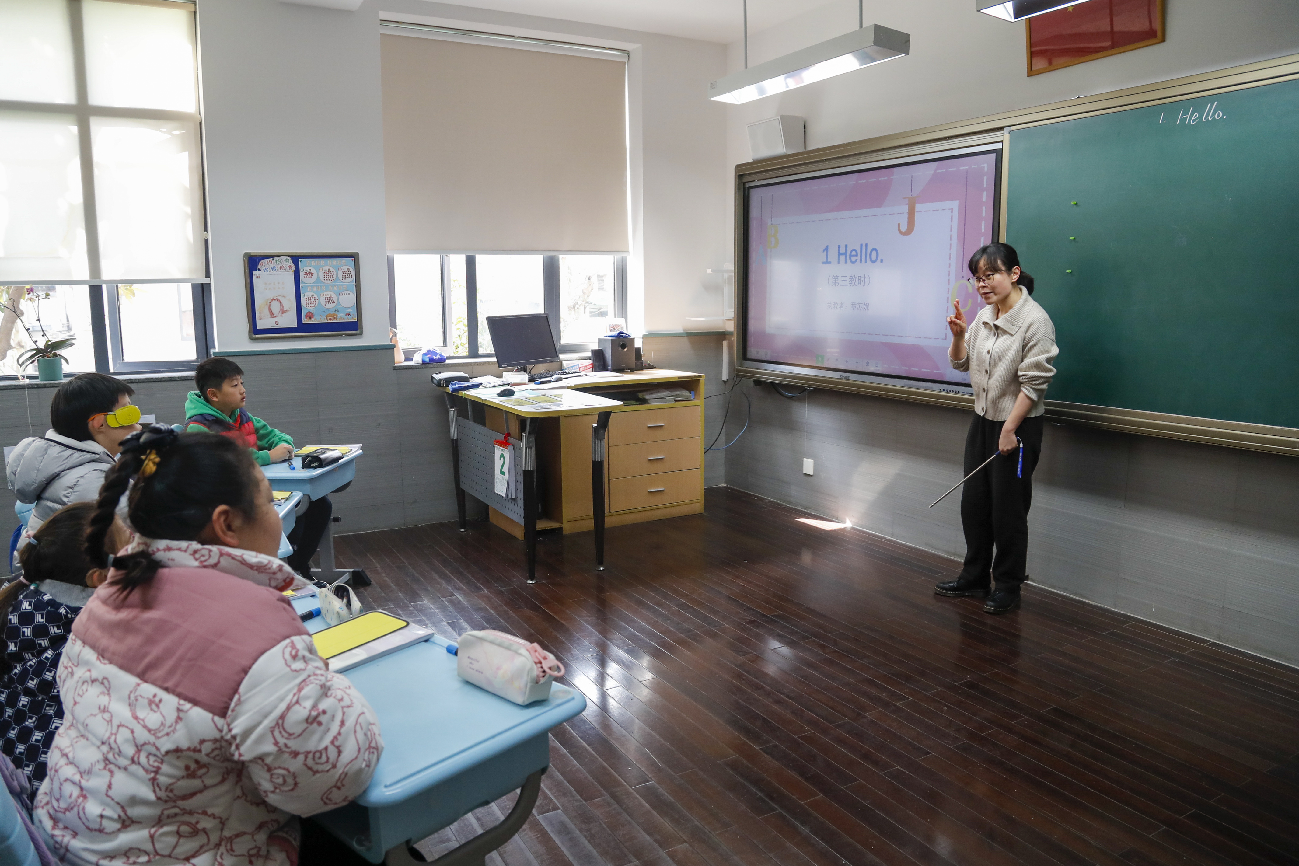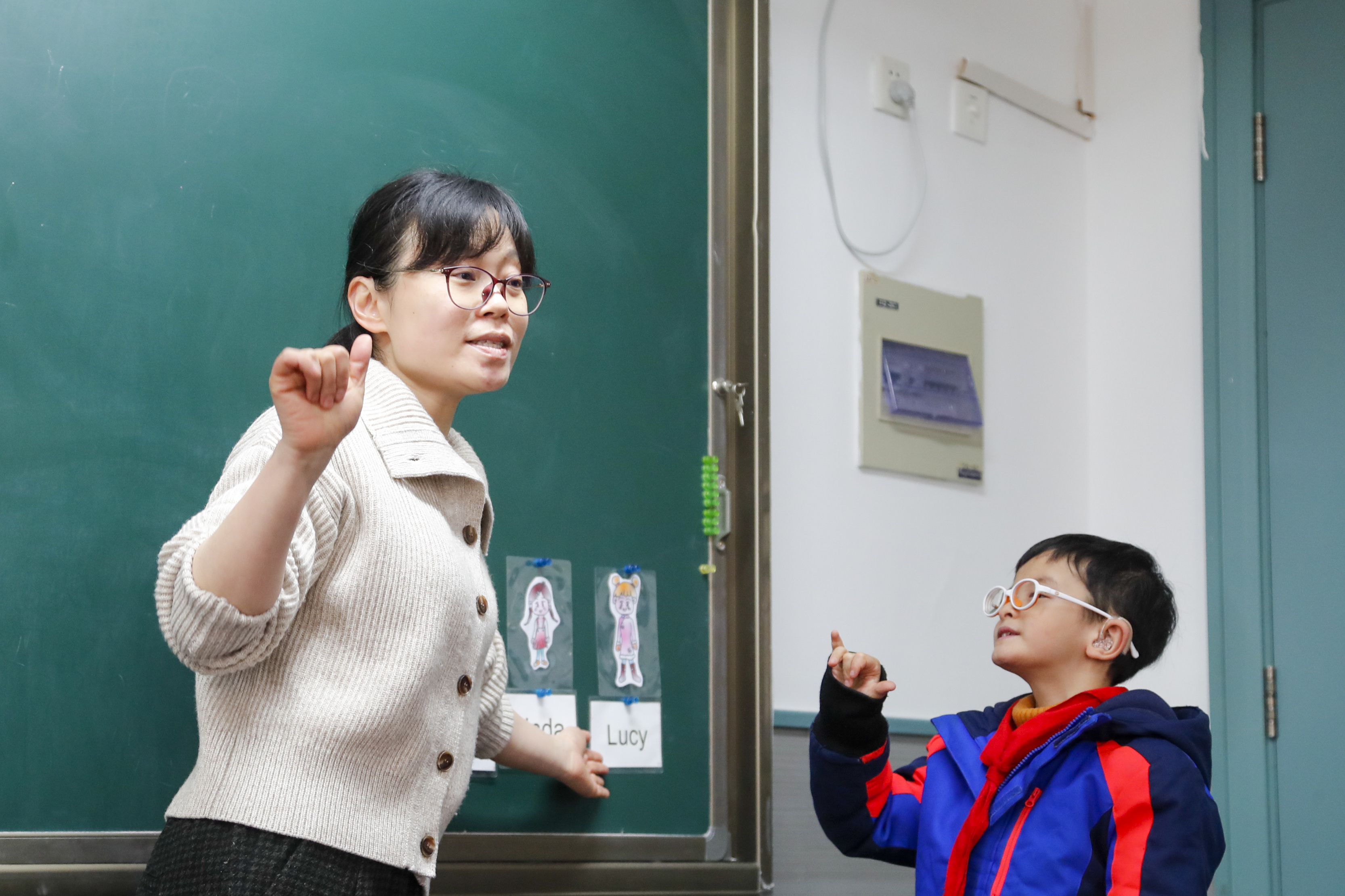 “我们先分开读h-e-l-l-o,连起来读hello,表示问好的意思。”风和日丽的初春,四聋五年级教室里传出阵阵朗读声,原来是英语老师章老师正在授课,“接下来我们看视频。”视频播完,一位学生表示速度太快,章老师又播放了慢速版本的视频,在学生表示跟得上后,中速版的视频又放了一次……就是在这样一次又一次循序渐进地教导下,四聋的孩子得以成长。