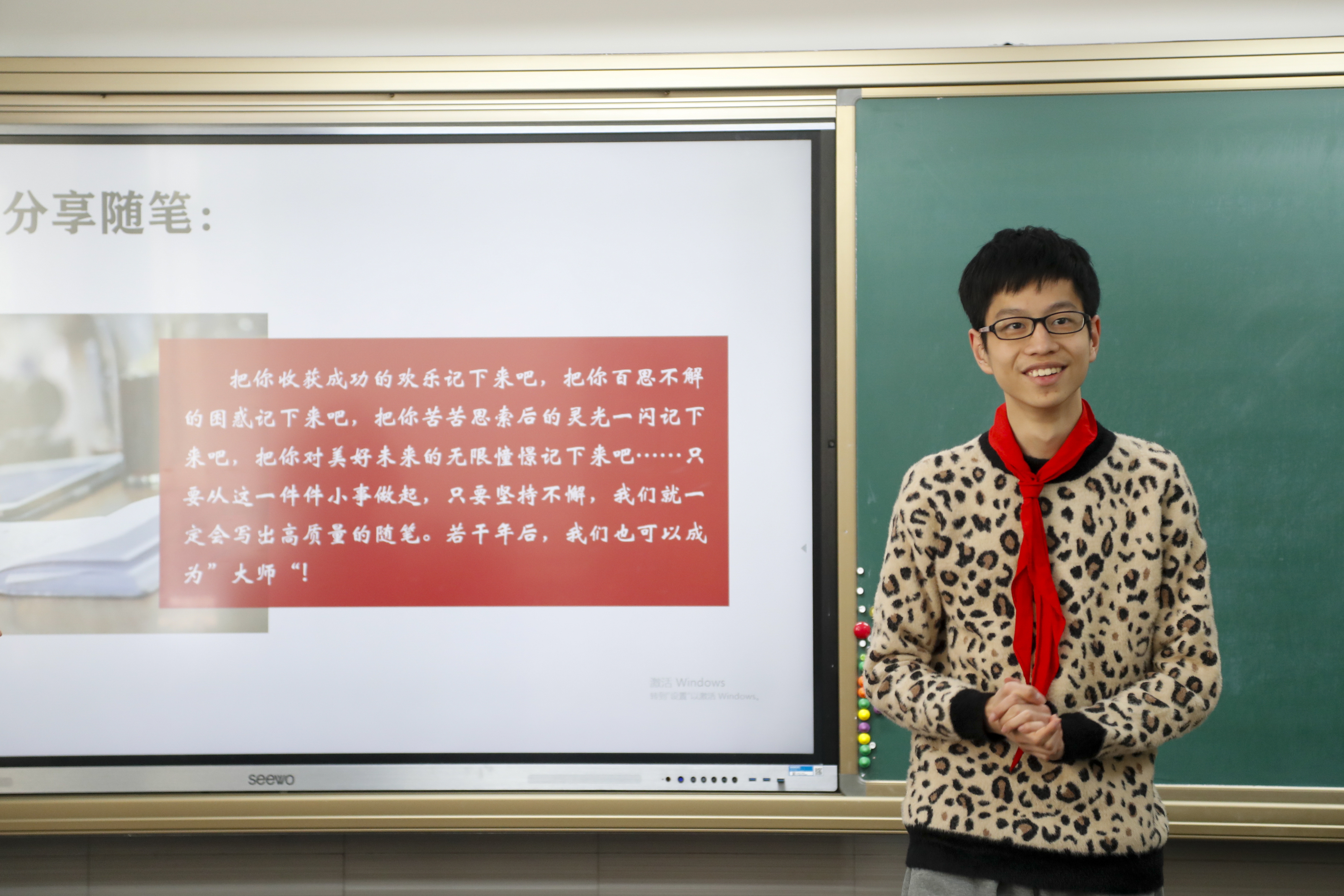 9年级的季天皓刚完成一堂活动课,便上台把自己刚写的日记与同学们进行分享,在这里,每个孩子都是主角。