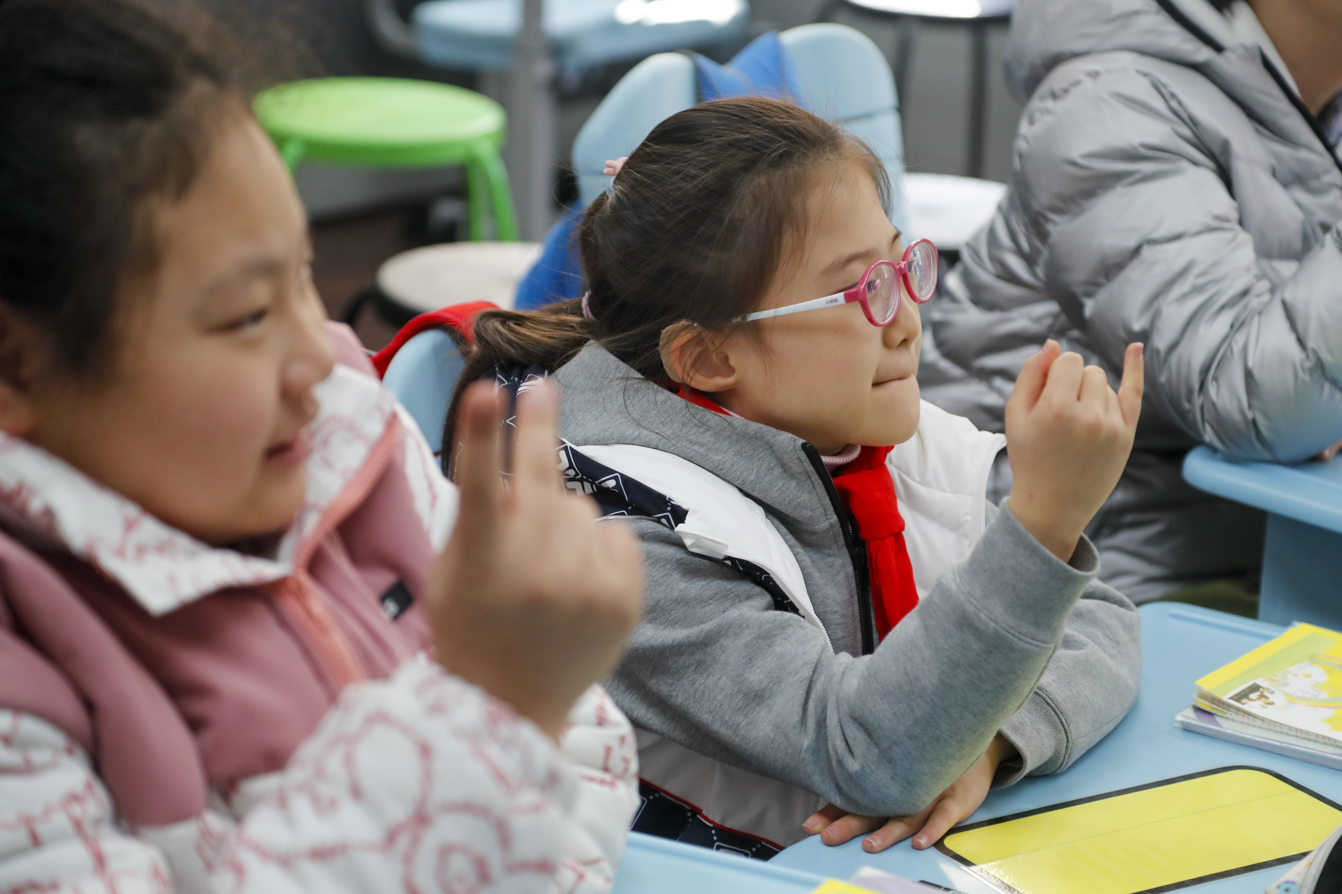 据吴蓓芬介绍,和普通聋校的孩子相比,四聋的孩子虽都有不同程度的听力障碍,但在学校日常生活中,孩子们均用语言交流,再辅以手语表达。“这也是我们四聋的教学理念。希望我们的学生参与社会的各种活动,不要因为残疾而自卑,而要真正融入到社会。”在这样的理念下,四聋的孩子接受国家版的统一教材,语数英都在其中,只是把音乐课换成了律动课,即让孩子们通过打鼓、感受地板震动等视觉和触觉的途径感受音乐节奏。