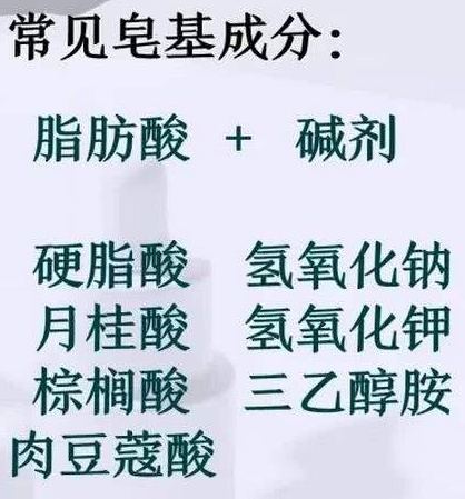 如果在成分表的原料中出现硬脂酸、棕榈酸、肉豆蔻酸、月桂酸中的一种或几种,且同时出现氢氧化钠或氢氧化钾或三乙醇胺,那么这个洁面产品基本上可以判断为皂基型洗面奶。如果在上述成分的基础上还辅有油脂、甘油、丁二醇等保湿剂成分,那么一般来说,这样的洗面奶会比单纯的皂基洗面奶温和一些。