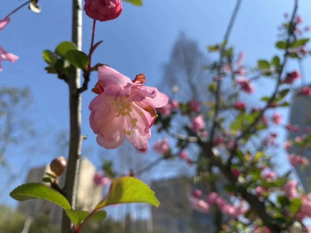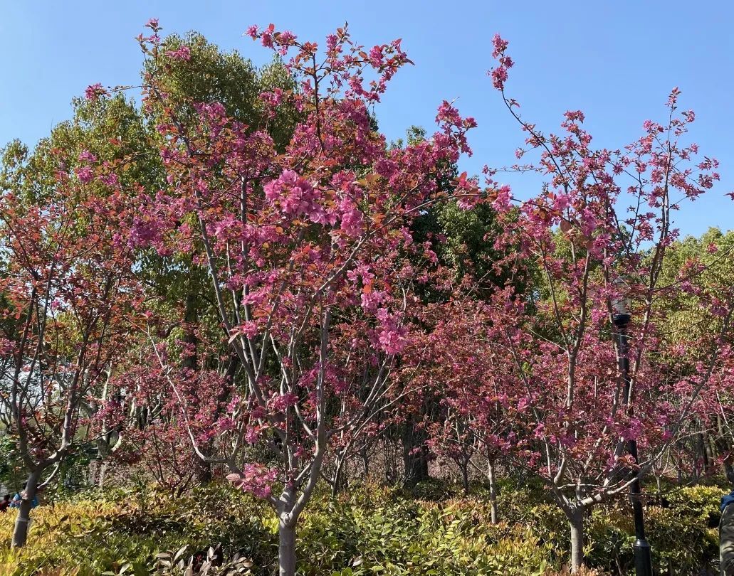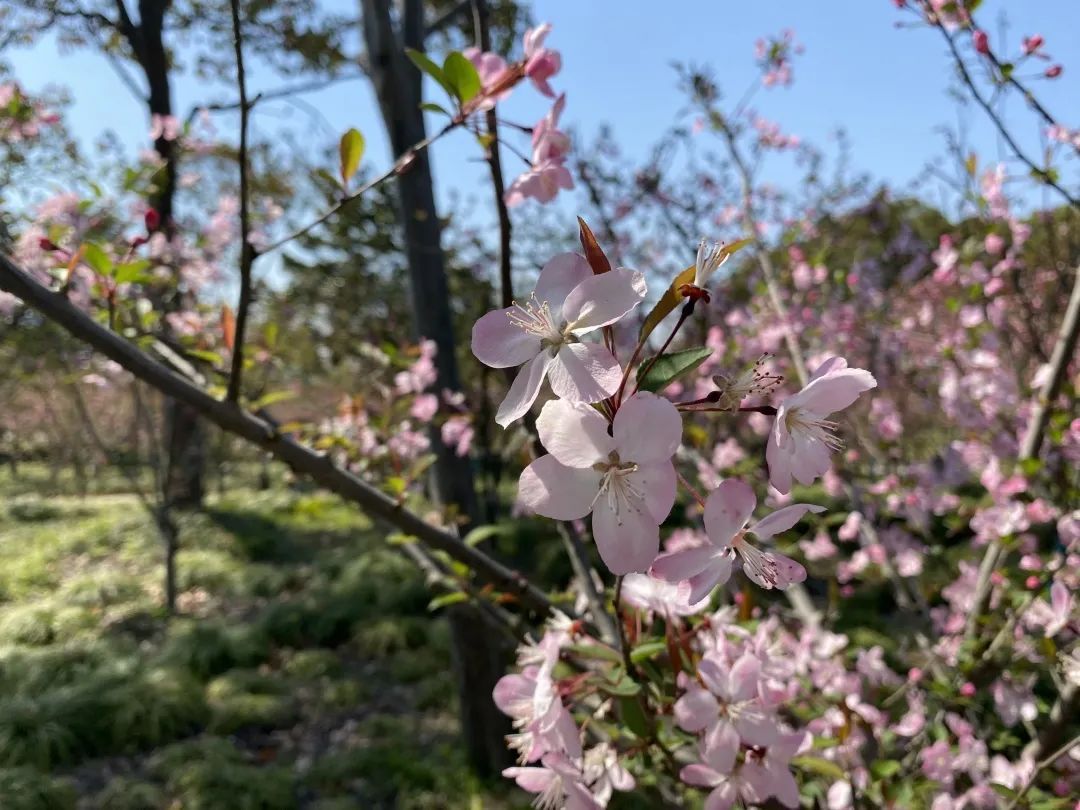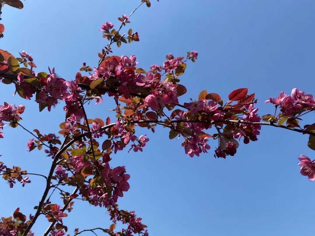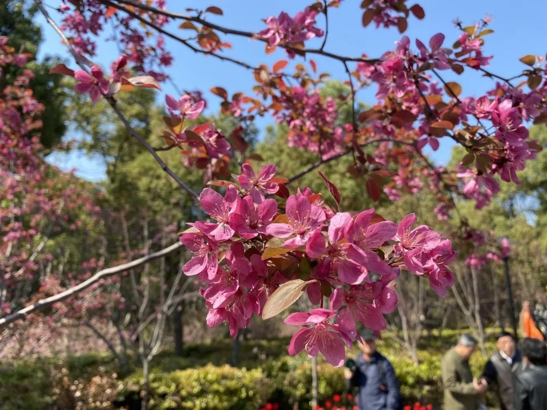除了垂丝海棠外,园内还引进了北美海棠,花色鲜红,观赏性极强。区别于粉嫩的垂丝海棠,北美海棠更加艳丽鲜亮。