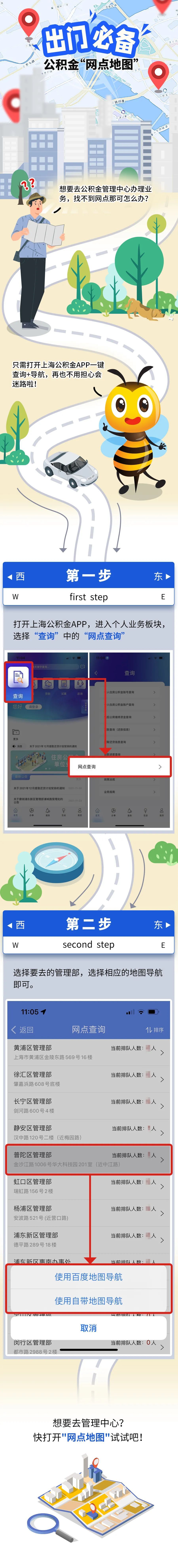市住建委开通了公积金“网点地图”服务。打开上海公积金app,选择“查询”中的“网点查询”即可找到办理业务的网点。详见↓
