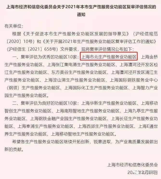 日前,上海市经济和信息化委员会对外公布2021年上海市生产性服务业功能区复审评估情况,静安区市北高新园区不但顺利通过复审评估,而且在十个复评为“优秀”的功能区中名列首位。